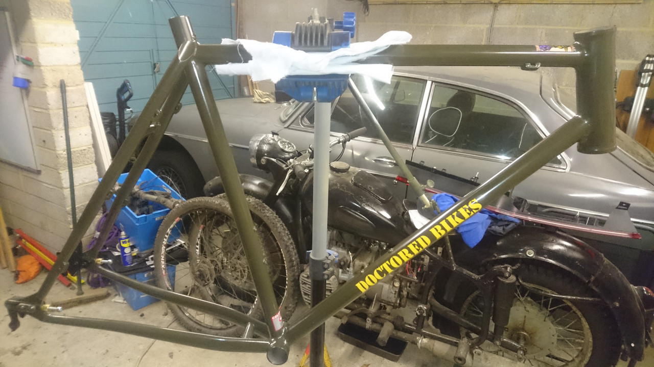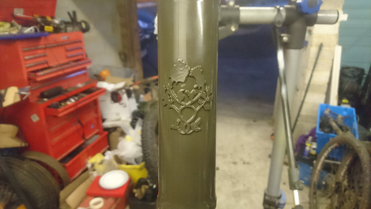 Finally got round to making an intertwined thistle and rose headbadge. I was going to san off the powdercoat and polish but given he wanted the frame army olive drab I thought I would leave it stealth green.