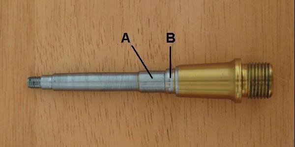 Part "A" is where the bush runs and should be the same diameter as part "B". The nylon bush has worn away the Titanium axle. Amazing.