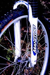 Externally, the forks have the new radiator crown for 2001 which has a bonded, in forged aluminium steerer and bonded in cro-mo stanchions instead of last years bolted crown. As with last year’s Air Force I, however, the II has a single magnesium brace and magnesium dropouts with ISO 100 disk mount.