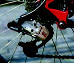The spangly white 9.0SL groupset sits at the top of the SRAM range. The rear derailleur uses SRAM’s ESP 1:1 cable pull ratio so won’t work with Shimano shifters. We’ve been using it with SRAM’s 2001 9.0 shifters which feature a new light-sprung shift between gears. These have been surprisingly good and won over many an ex-Gripshift user who’d moved back to Shimano Rapidfire in recent years.