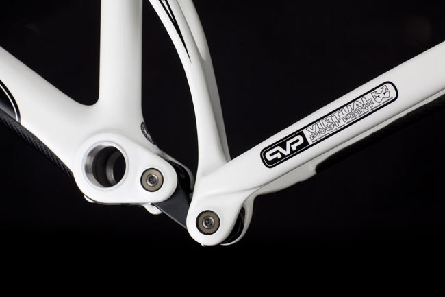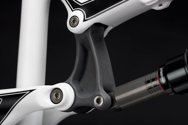 Alongside the carbon fiber makeover, the VPP suspension, and the trickest pivot hardware in the world, we added an impact absorbent protection strip underneath the downtube and along the drive side chainstay and seatstay. There’s a metal plate where the chainsuck gremlins usually strike. You’ll find cable stops for dropper seatposts integrated into the frame. An ISCG05 chainguide mount is molded into the bottom bracket area during lay-up, as are the disc brake tabs and dropouts. There’s a 1.5″ headtube up front, since we figured this bike would probably be getting treated with a bit more abuse than most taper-steerer forks would be intended to see. You can have it any color you want, so long as you like white with black decals or a matte carbon color with gold pinstripey decals.
