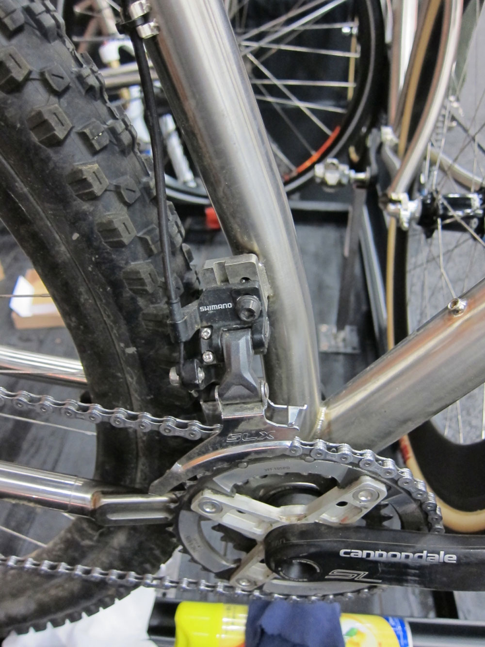 the internal hydro routing is on a Vertigo Cycles ti 29er. it is welded in ti tubing. the process if getting it fitted (it routes around the bb axle, inside the shell – with 0.5mm clearance no less!) is complicated and requires some precision work but it gives an uber clean look.