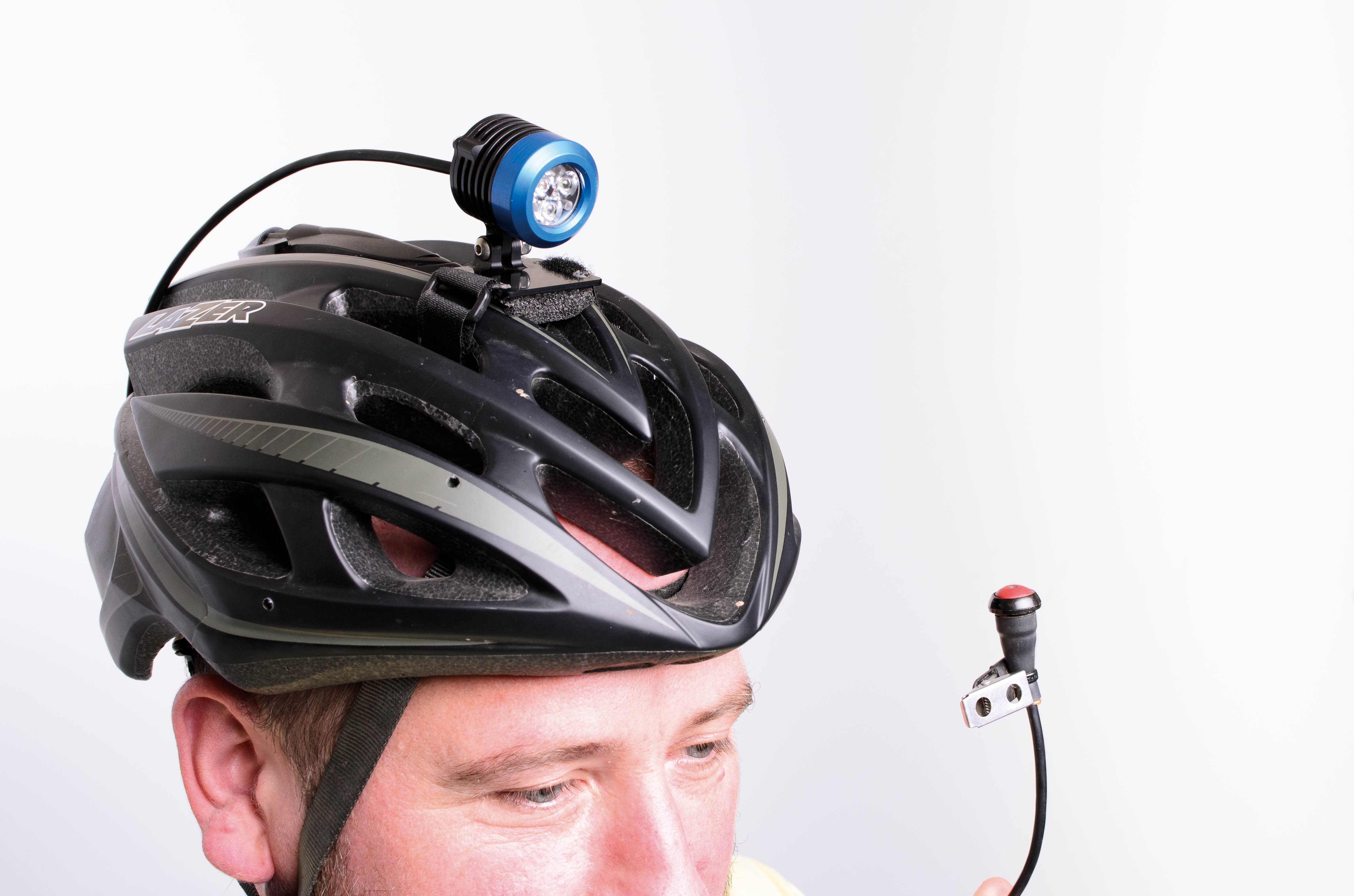 The catchily-named Ray-3a is at the other end of the faff spectrum to the Exposure Lights systems. The head lamp unit goes onto the helmet simply enough (the usual Velcro loop) but then, as well as stringing the battery cable into your backpack (or jersey/jacket pocket) in as neat and un-snaggable a way as possible, there’s a secondary cable with a button on the end that you need to pass under your armpit to clip on somewhere easily accessed. The idea is to position the button in as convenient a place as possible (ie. a rucksack strap). It’s a good idea in theory but out on the trail it doesn’t really prove to be any quicker or safer than operating a button situated on the lamp unit on your helmet. All in all we’d be quite happy to put up with a button on our head in exchange for a less-tied-up-in-cables affair that makes it easier to change clothing layers or get something from your Backpack. The illumination on offer however is brilliant. A little bit more oomph than the Exposure Lights Diablo, with a similarly well-executed beam array. Penetrating depth with a clean pool of light for immediate terrain. The lamp unit is light enough not to be noticeable, is easily tilt-adjustable and stays put during rough rides. The burn times – four hours on full power – are impressive, and further make us question the point of a remote button/switch (just leave it on high).