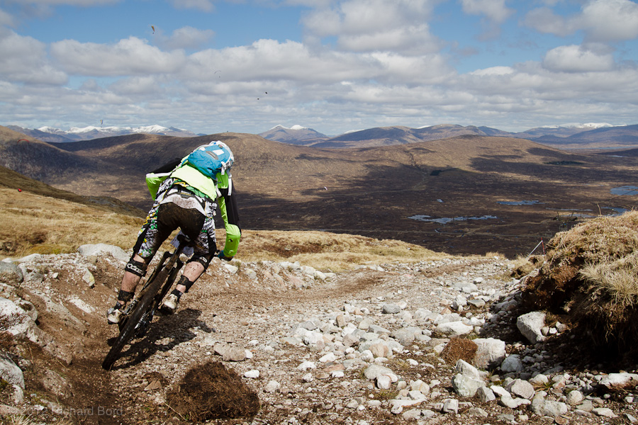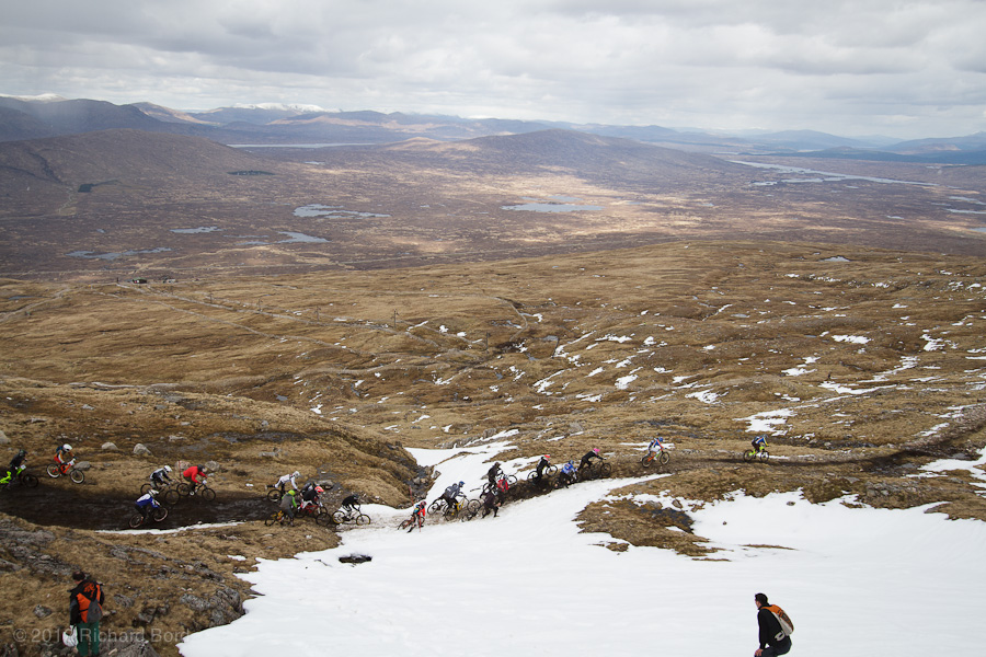 The trail itself was pretty wild with large, open expanses of tussocky moorland and drops into surprise, wheel grabbing holes wanting to pitch you out the front door and into the bog. It was also very pedally. Once you completed the middle section of the track (disregarding the snow for now) and arrive at the top of the first chairlift station it was onto part of the infamous Glencoe downhill track, traverse the hillside, one more potentially front wheel-swallowing moorland before a fast and rocky ride to the finish.