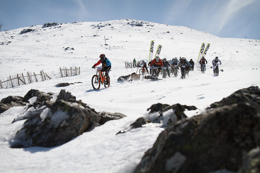 Fast forward to the top of the cliffhanger chairlift and the top 33 riders are assembled awaiting the B final to pass from the piste and past the lift station before we could head up to the start. Some riders where practising their snow riding on the patches surrounding the mountain hut. The riders from the B final and the top ladies stream past as the rest of us watch and cheer. Once the final rider has passed we begin the final push to the start point, around 200m below the summit of the mountain. The snow is soft and deep, and it seem that at any moment you can go from walking on the surface to being knee deep in slush. I break the buckles on my XC shoes and have to make some last minute repairs.