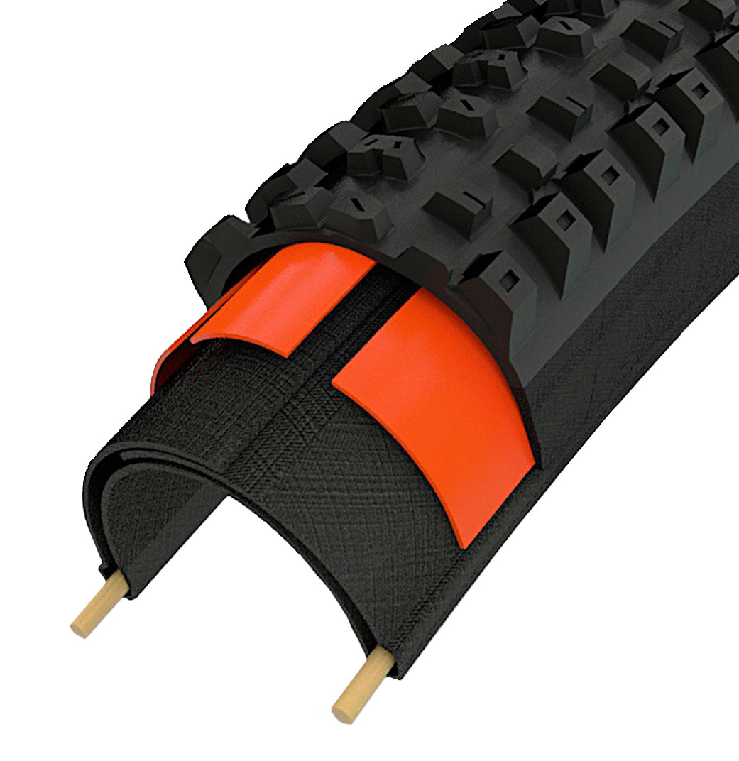 Now, Frank has taken a part of that process and changed it a bit to come up with the SE4. His change is at the sub tread stage. Normally the sub tread would just be a complete piece of material like nylon that is laid over the top of the casing – It’s a popular inclusion on DH tyres for example. This reinforces the tyre all across it’s width (On the SE4 this increases cut resistance by a claimed 152%). What Frank has done though is split that entire piece into three strips with two 5mm gaps between them. The gap is positioned carefully to lie just under the shoulder of the tread. The result is a flexible 5mm strip (the ‘hinge’ reference)  on each side of the tyre. It’s protected from damage by the shoulder tread itself and this flexible strip is designed to allow the tyre to flex vertically so it will track the ground better and hence give a smoother ride with more traction.