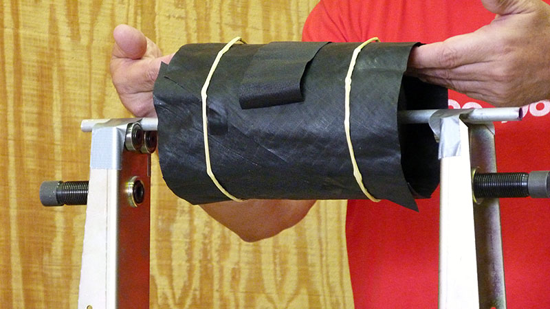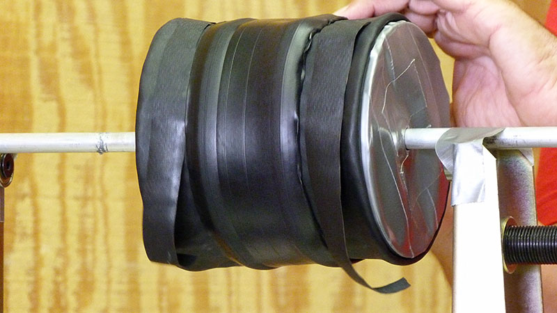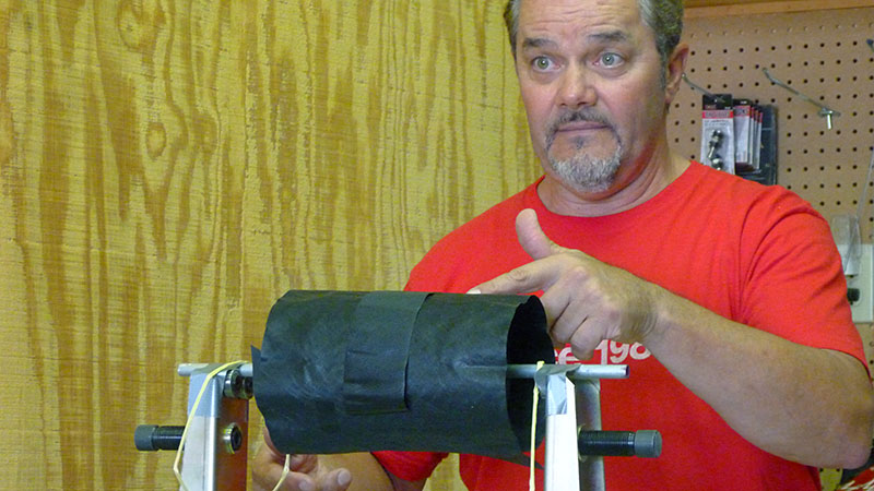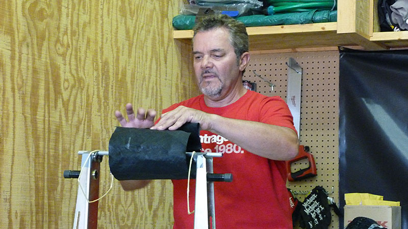 Frank told us he had done something different enough with his latest tyre that it was worthy of a new Patent, which is apparently now pending, but before he could tell us about that specifically he reckoned he needed to educate us all on just how a tyre is made. With the aid of a presentation booklet of factory images and a home made jig he had set up in his garage, he did just that.