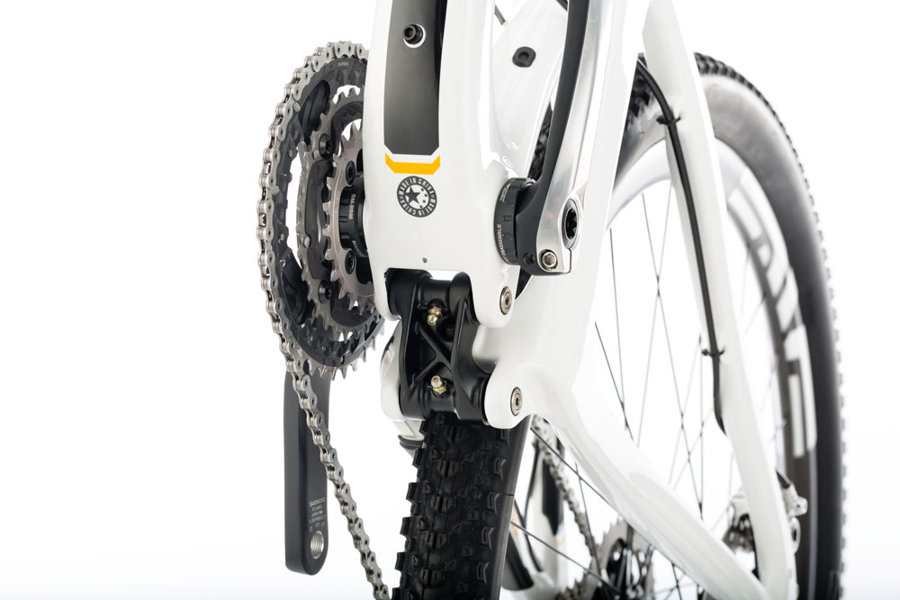 The weight of the Large carbon frame is 4.9lbs (in matt black) so the bike has lost a little over the previous model. It’s also gained some invisible structural improvements. Interestingly the carbon shock link is gone. The alloy link there now is lighter and way stronger, apparently. The frame now has a direct mount front mech and retains a 73mm threaded BB.