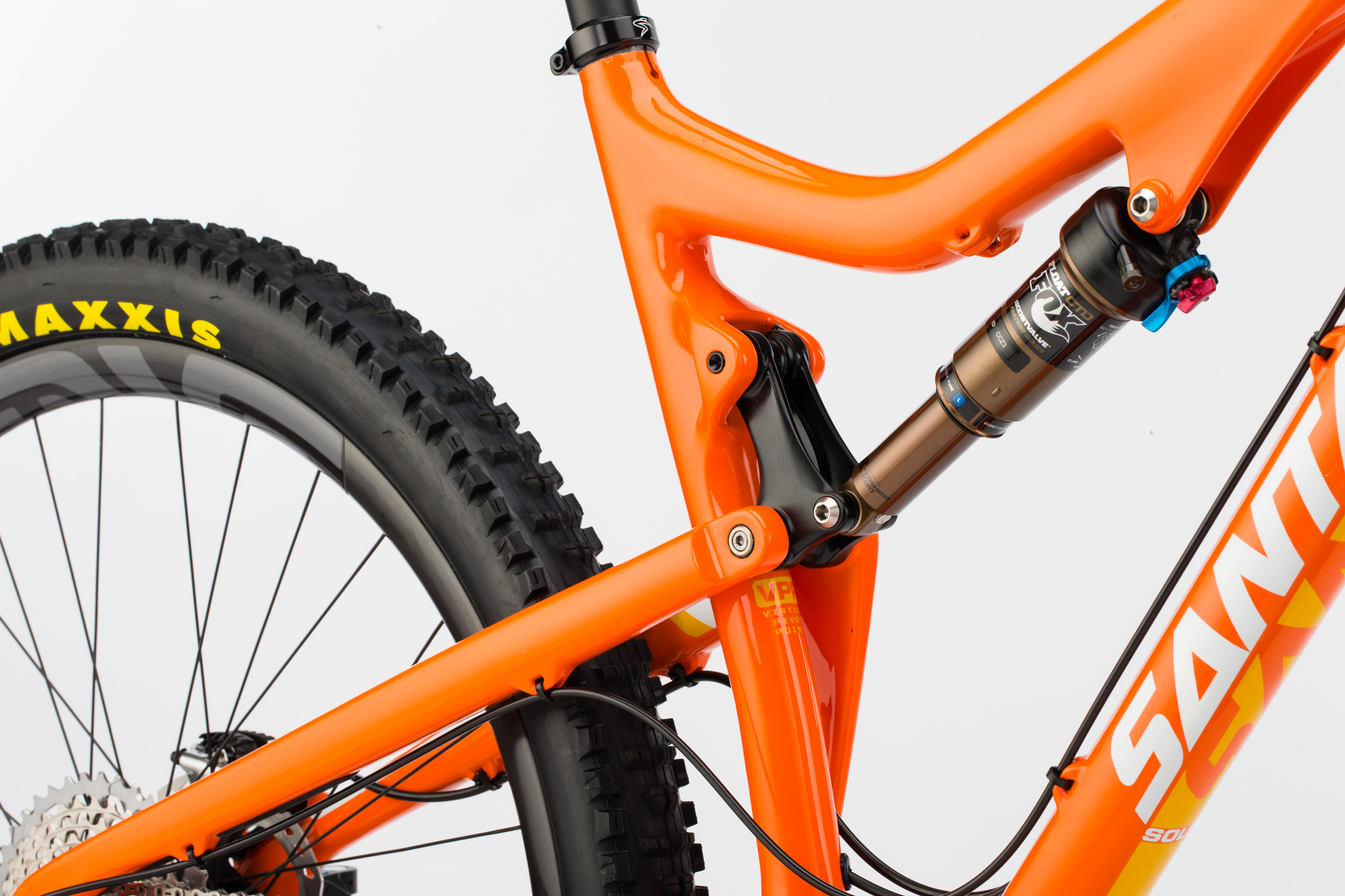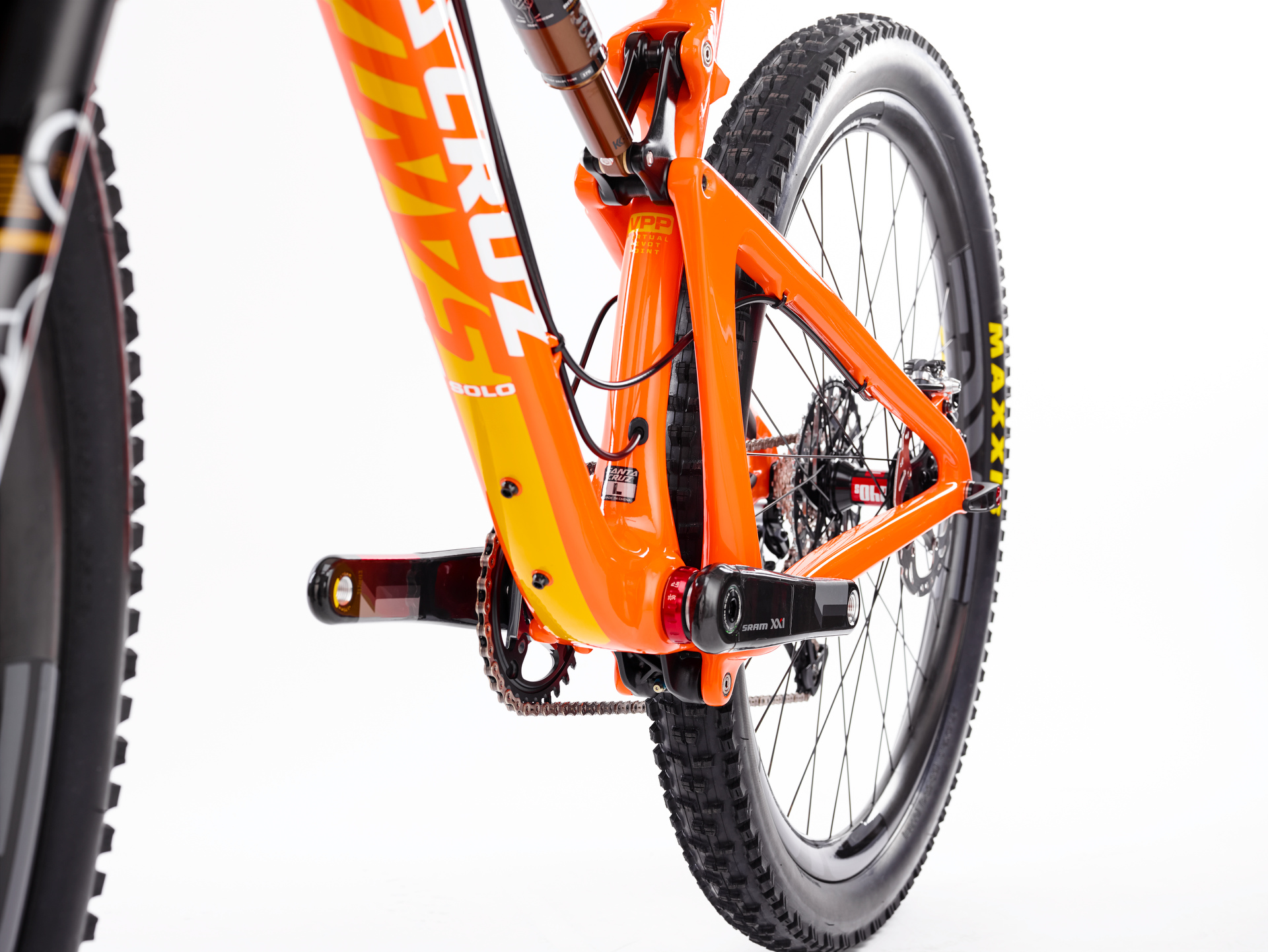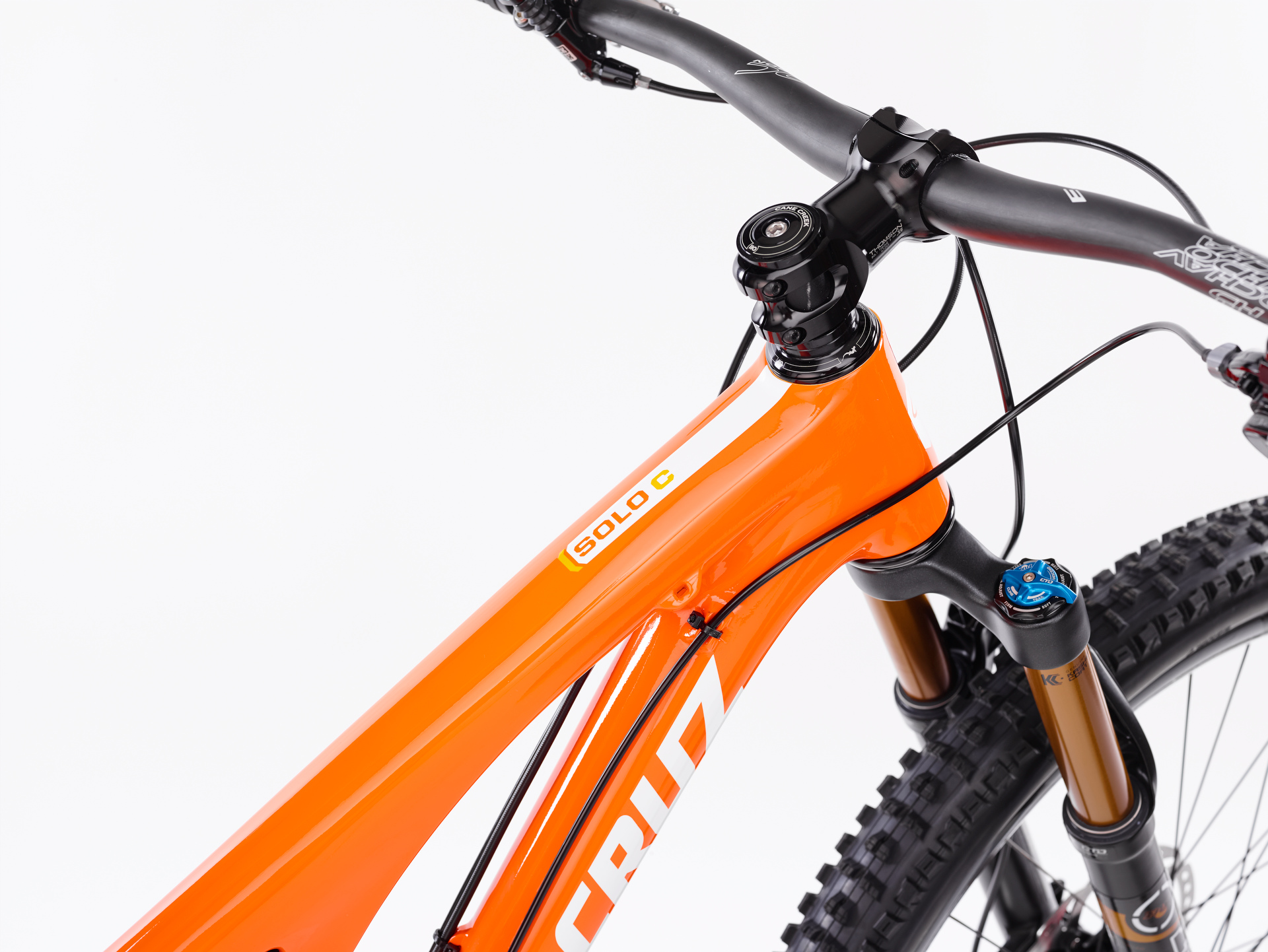 The Solo will come in S, M, L and XL sizes. The medium carbon frame is a hair over 5lbs. There are two bottle bosses, though Santa Cruz don’t seem to be pitching this as an XC race bike. It’s a trail bike. A little less hairy than the 150mm Bronson, although there are still ISCG mounts for a chain device and 142mm dropouts for stiffness (not that QR carbon Santa Cruz bikes are flimsy…)