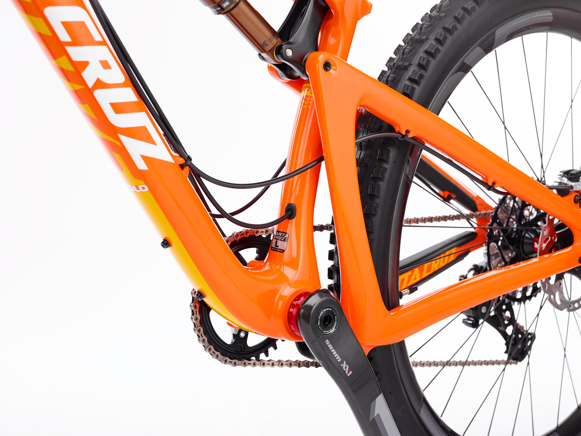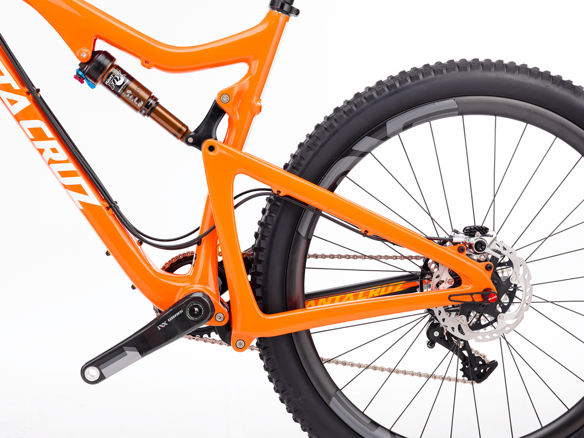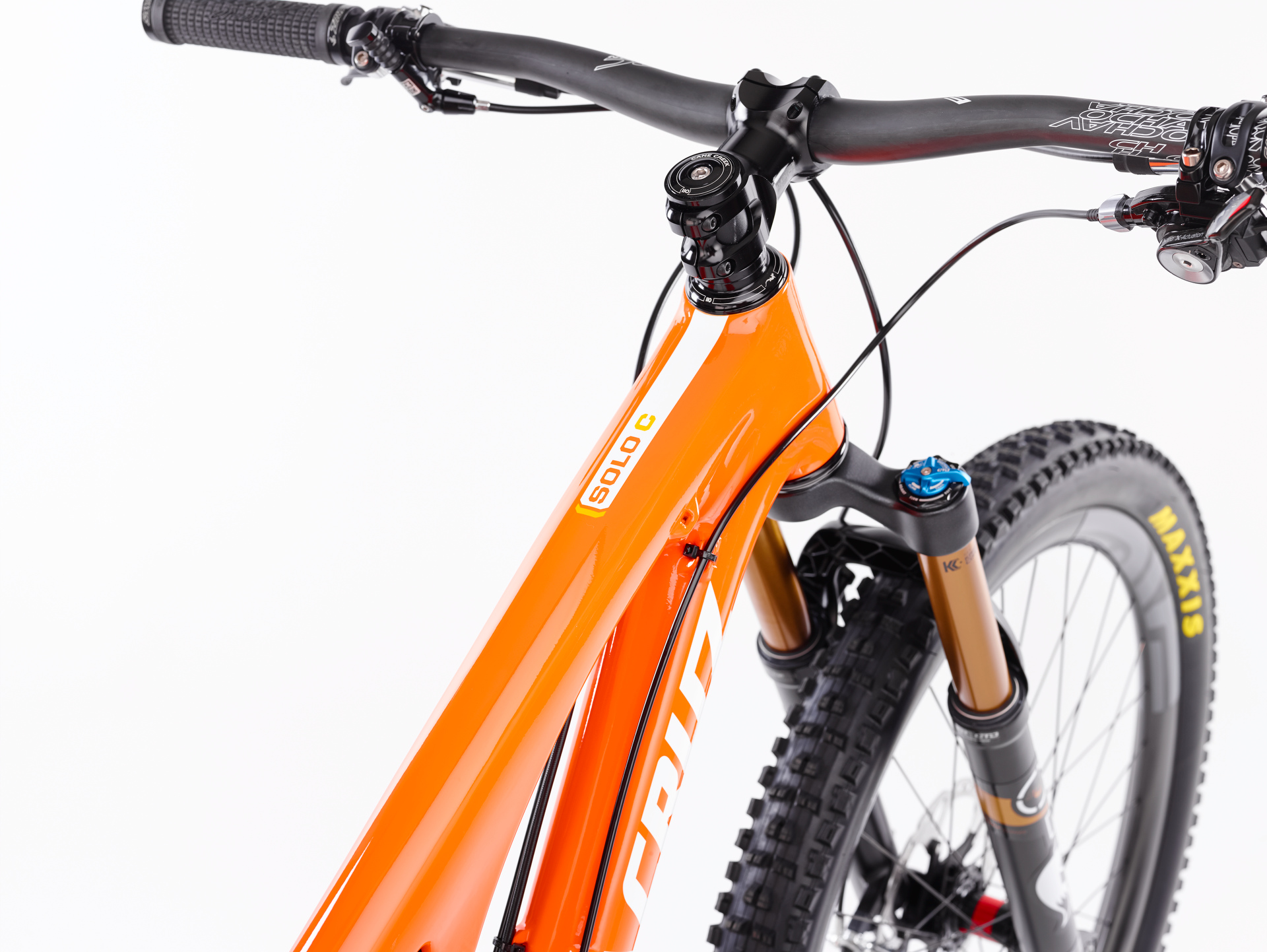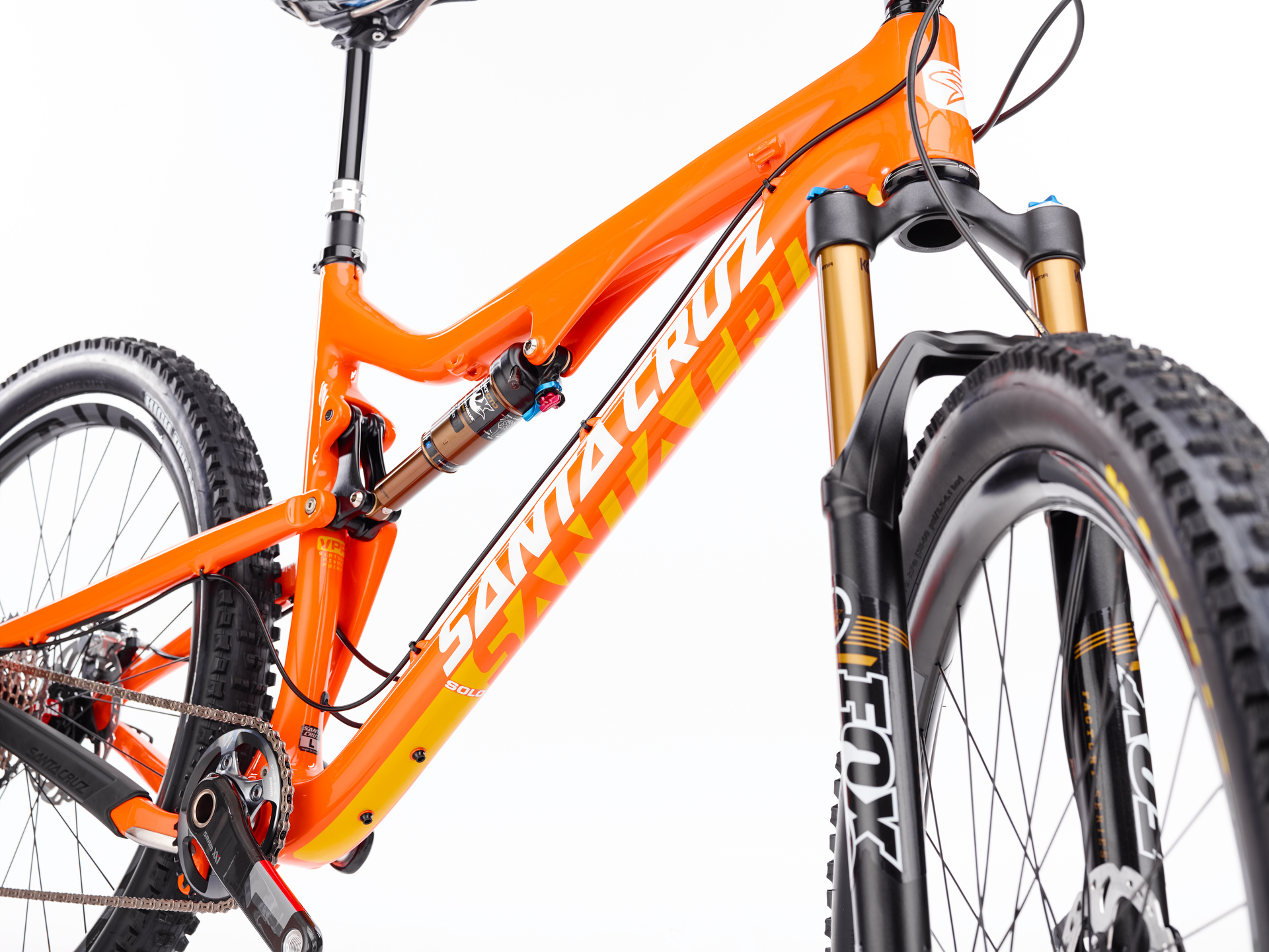 The Solo will come in S, M, L and XL sizes. The medium carbon frame is a hair over 5lbs. There are two bottle bosses, though Santa Cruz don’t seem to be pitching this as an XC race bike. It’s a trail bike. A little less hairy than the 150mm Bronson, although there are still ISCG mounts for a chain device and 142mm dropouts for stiffness (not that QR carbon Santa Cruz bikes are flimsy…)