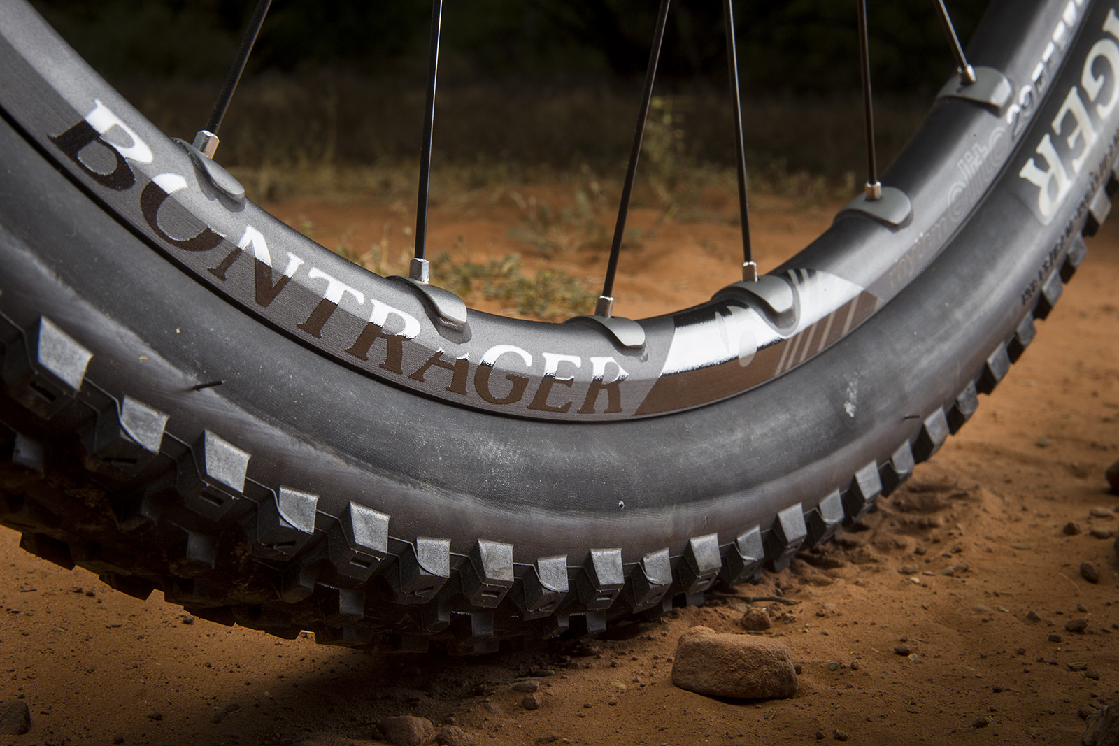 The top tube slopes downwards dramatically, creating a very comfortable standover space that helps keep the overall impression of a smaller bike – that’s important if you are hoping to get short sub 5’6” riders (like me) interested in bigger wheeled bikes. The tyres on our test bikes were standard Bontraget XR4 rather than the, also launched at the event, SE4 – it’s likely that the higher spec Remedy will switch to being stocked with the SE4 as standard pretty soon. The wheels are the new Bontrager Rhythm Elite TLR. You can read all about those here