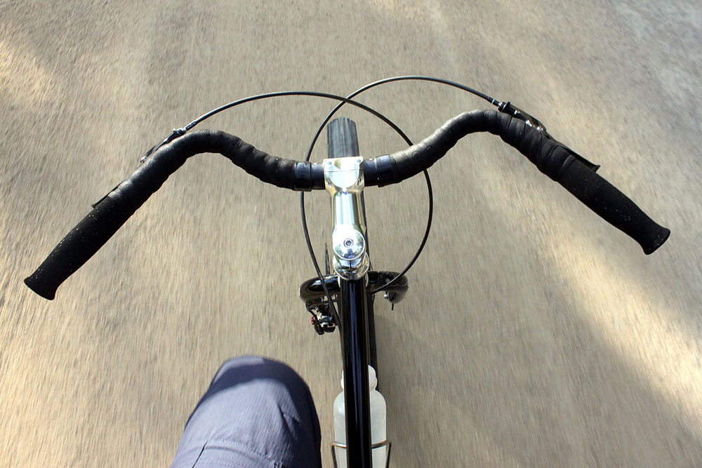 Width is 660. The weight is 328g, which makes it way lighter than any other Jones bar – even (or especially, depending on your view) the titanium H-bars.  Initially, they look similar to an On One Mary bar, but the sweep (45°) is much greater and places the hands halfway between a regular straight bar and a road bike brake hoods – somewhere that Mr Jones considers to be perfect.