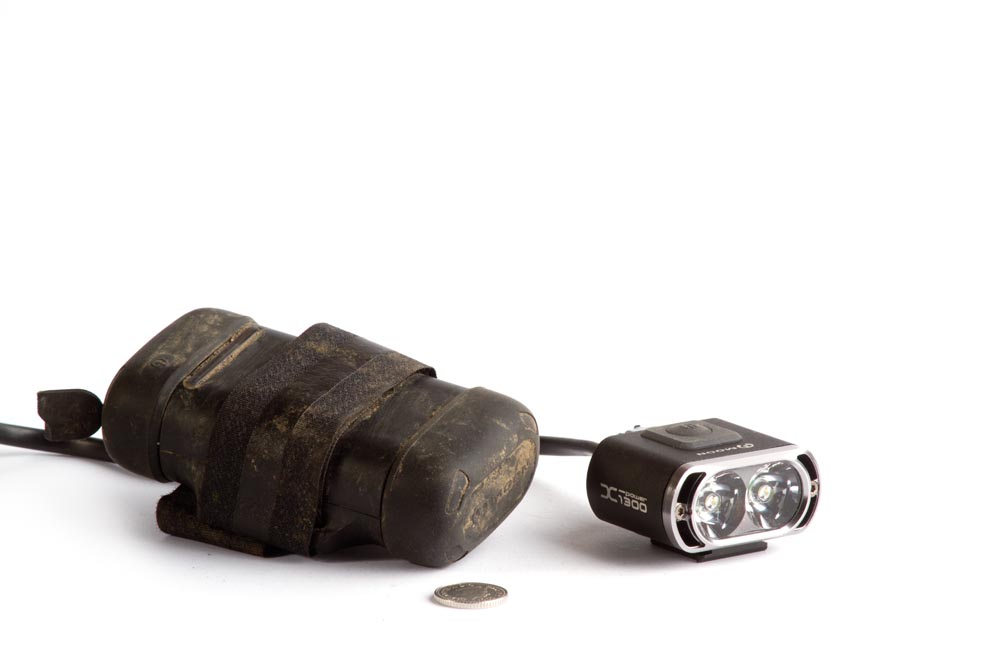 In addition to the colour-changing, battery life-indicating button on the lamp itself, there’s a line of small red LEDs on the battery pack that will tell you how the battery is doing. These can also be lit permanently so you can use it as a rear light, which is neat, as is the USB port which can power another device, e.g. GPS or mobile phone.