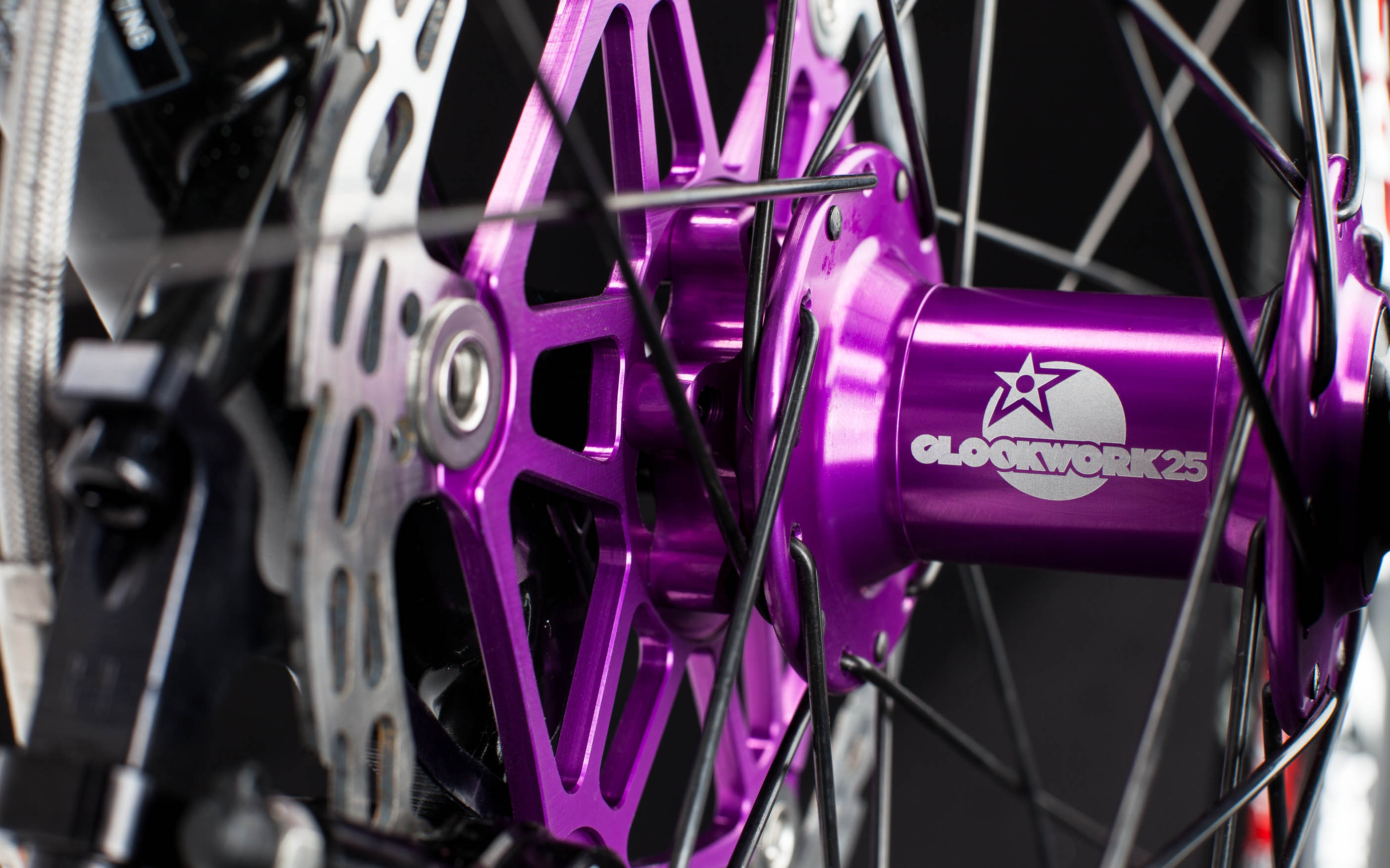 Purple anodised Hope hubs, rotors, BB, seatclamp, headset, skewer, brake caliper bore and reservoir caps give a nod to the past, while being very much at the cutting edge. Both the 28 spoke hubs and brake reservoir caps are custom laser engraved with special-edition Clockwork 25 artwork to match the frame’s decals.