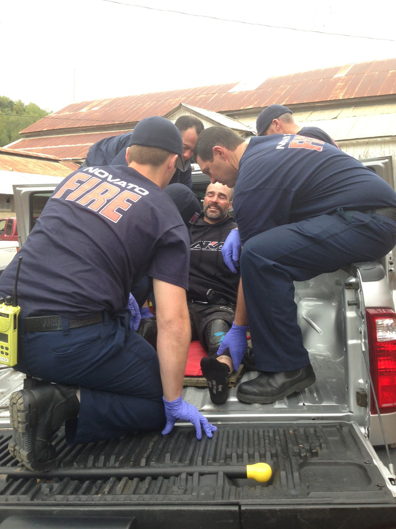 Weir’s pelvis was broken in three places and it took the ingenuity of his riding pals, including enduro-racer Ben Cruz, to gingerly carry Weir down from out of the trees on a home-made backboard made from a bit of plywood, to the point where the Novato Fire Department could get him stabilised and off to hospital. He’s now back home, under orders to have six to eight weeks of bed rest.