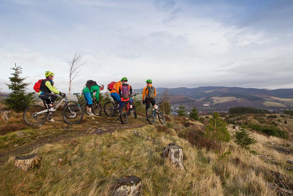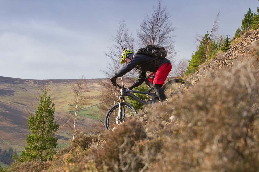It’s an easy ten-minute spin from the middle of Peebles, yet is virtually deserted. There’s a well-graded forest track from the car park that slowly conquers the whole hillside. Unfortunately for us, we’re on the ‘best of’ tour and in order to see as many of the best bits as possible, we have to take the shorter, steeper climb through the trees. Before long, we’ve gained the altitude, and the view. From one side of a stump on the summit, you can see the trails slowly dropping off the edge back towards Peebles. Turning though 180° the view is altogether more wild, with more trails disappearing away, only this time towards imposing-looking hillsides and distant, snow-dusted mountains.