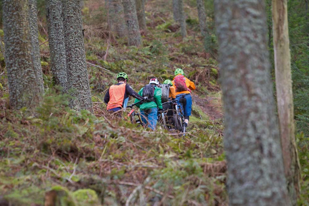 As we join up with one of the more committing trails, the difference between a fast, experienced local rider and a jobbing journo becomes apparent. The trail dips down, cut into the bare earth under the trees, unveiling the ‘sniper roots’ below, that are inevitably at diagonals to your intended direction. Unfortunate tyre choice means the tripod and the mince are the order of the morning.