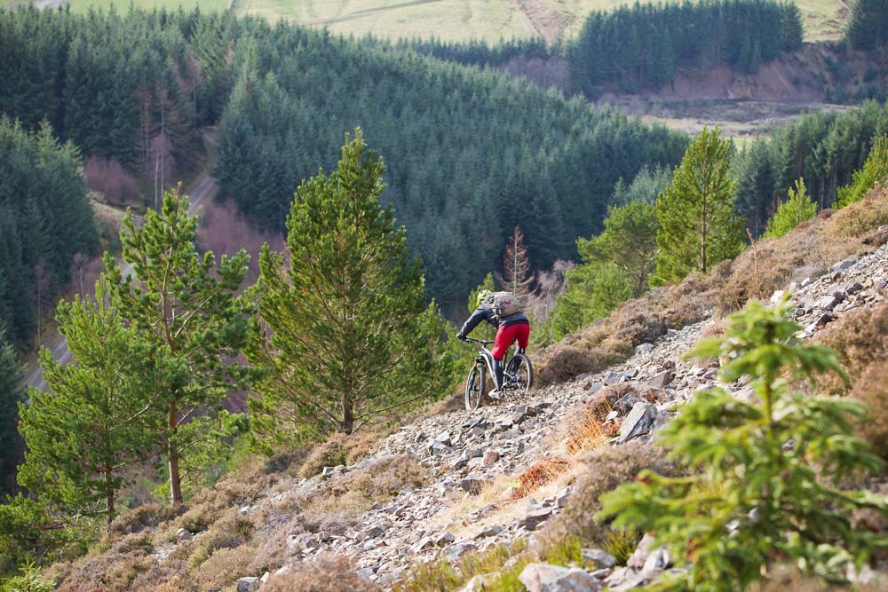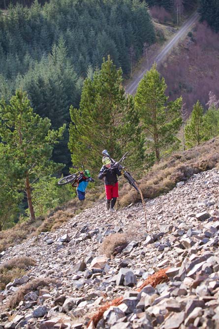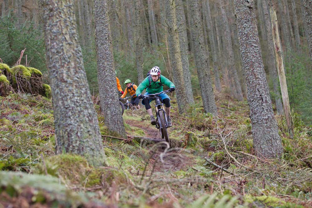 Stopping briefly at i-cycles to pick up owner Steve and visiting Silverfish rep, Raul, we skip over to the Innerleithen golf course. No putting for us today; we ride up into the forest behind the modest clubhouse and into the giant forest behind. No climb comes that easy, and this one feels long and full of chilli-burps, but the winter sunshine has stayed with us and the pace is conversational enough. We pause our mission to the top to briefly throw Richard, Dan and Steve down a clattery, shaley wall, partly for the camera and mostly for the breaking crockery noise they make as they free-ski their way down the vaguest hint of trail.