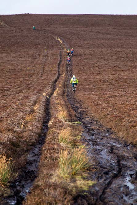 Back on track, we eventually top out by the old dry hilltop reservoir that used to power the textile factories down in the town. Even though it seems that we are at the top of the climb, there is still more climbing to do. Scottish hills seem to like doing that to you. We slide and shimmy up through the heather until we are finally, honestly, at the top of the descent.