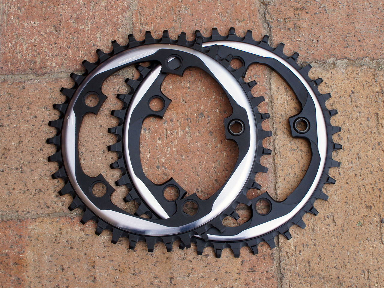 Teeth are offset to centre the chain when used with standard compact (110BCD) cranks. Chainrings running from 38t-46t (even) will be offered and ship with mid-length bolts and backers to ensure that everything comes together nicely and solidly. The chainring is designed to mesh with existing 10s and 11s SRAM road chains- no proprietary action here.