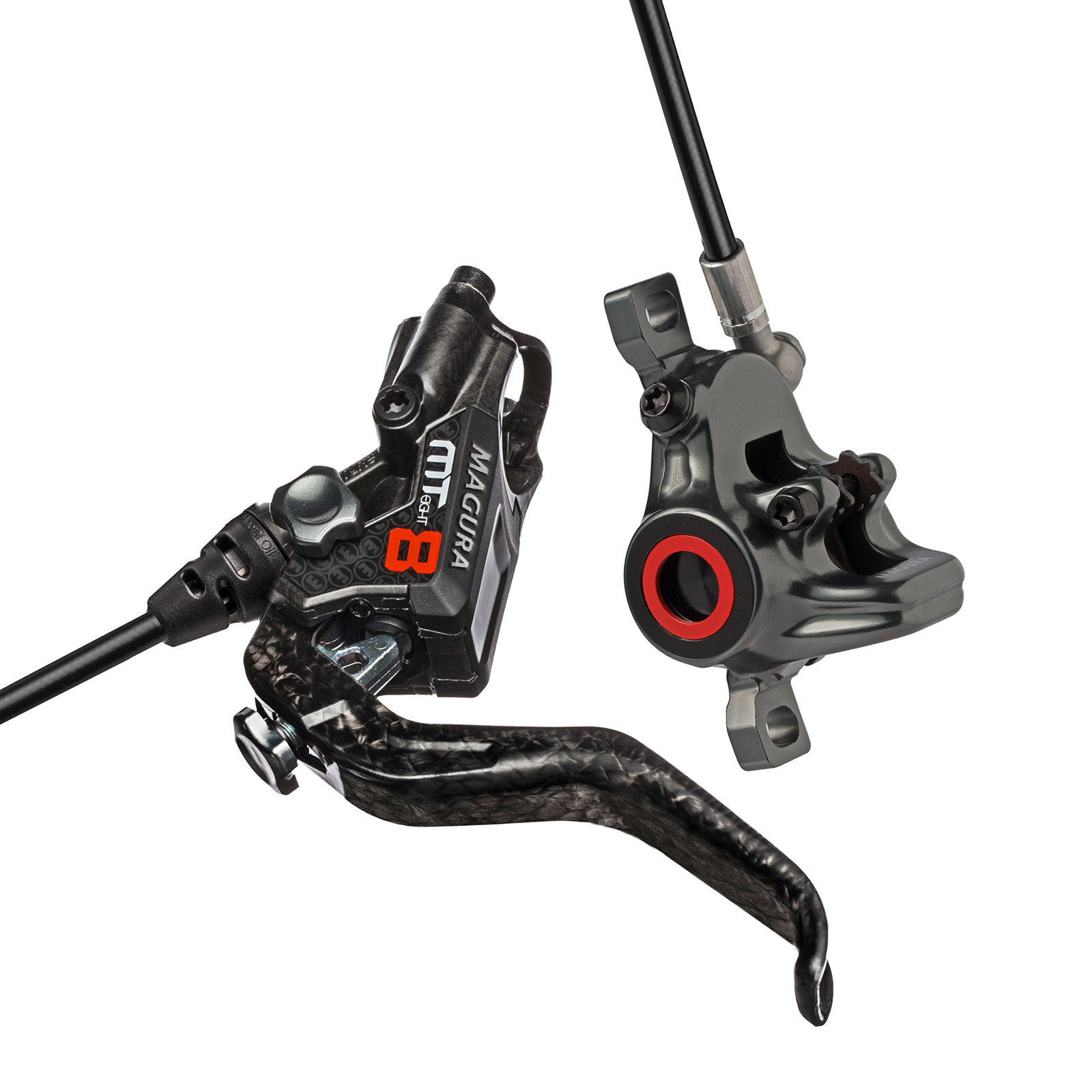 Each brake unit is made from Carbotecture – which is basically very strong, carbon rich, plastic that has been developed by Magura, although the higher models 5,6,7 and 8 are made from Carbotecture SL. This is essentially carbon fibre but with the fibres manipulated into a stronger lattice structure, making them lighter and stronger. Only the MT8 has actual carbon fibre levers. Both the four piston models come with alloy levers where Magura have decided weight is less of a priority over crash resistance. See below for weights and other stuff.