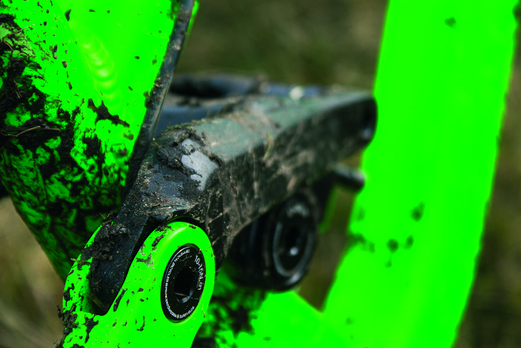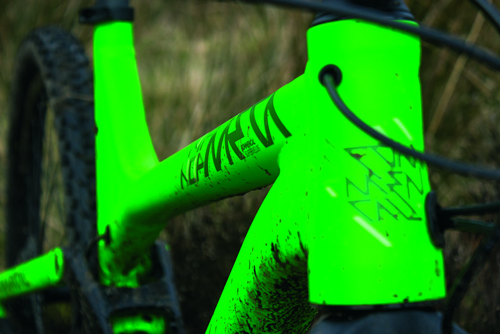 The remarkably green Hip Hop 2 offers 120mm of rear wheel travel with 140mm up front and is the second cheapest in the range. It’s a tidy-looking machine, with full outer gear cables and brake hose routed through the frame and swingarm with rubber seals that keep the crud out but make cable re-fitting relatively straight forward.