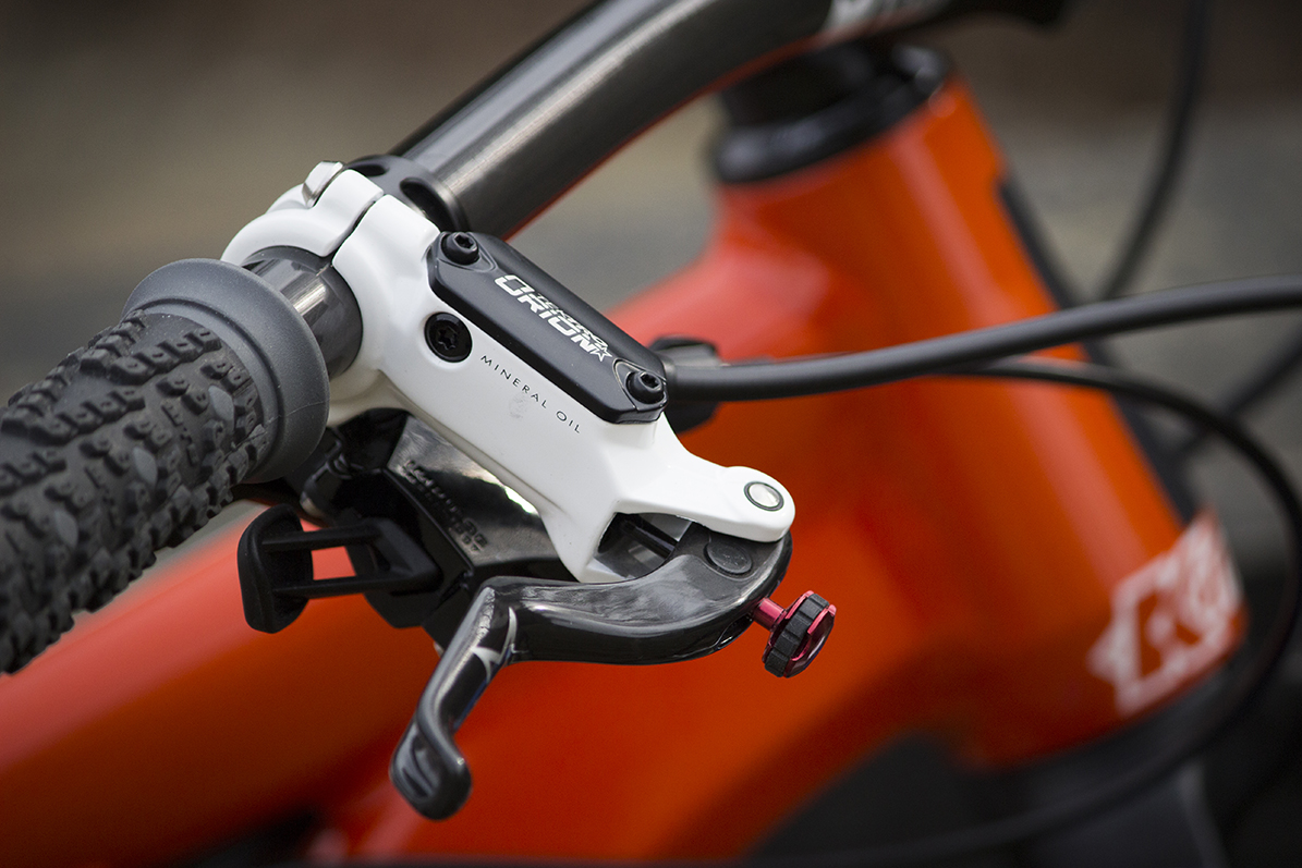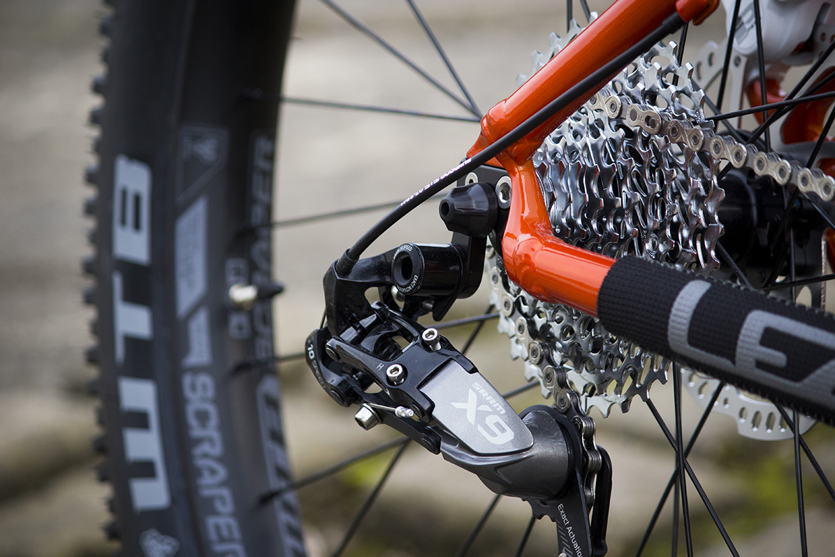 Up front a 160mm dual position Rockshox Pike takes care of business. There’s a nice short and wide Race Face cockpit and SRAM Guide RSCs take care of stopping duties. Wheels are a nice mix of DT Swiss 350 hubs matched to Stan’s Flow EX rims just waiting to be tubelessed up with Maxxis 3C Maxx Terra High Roller 2 tyres.