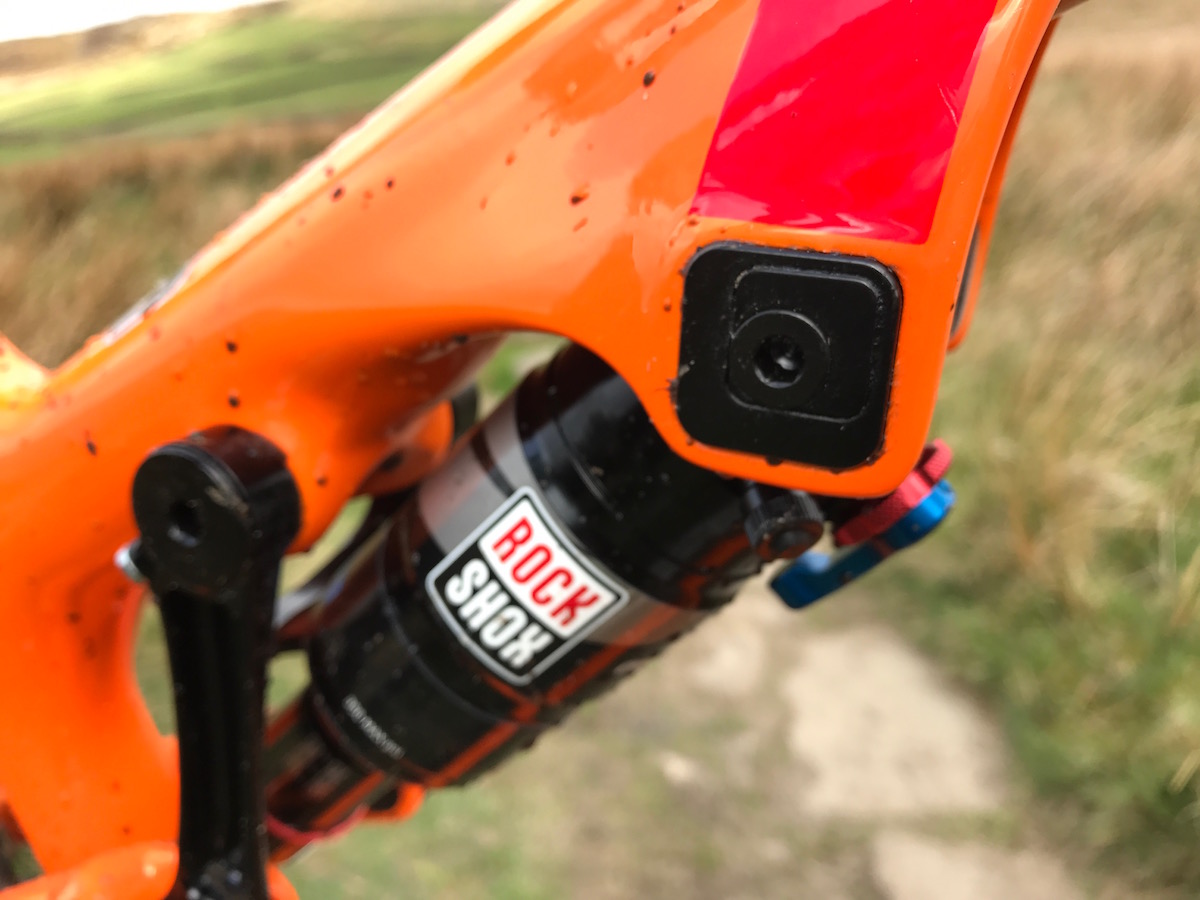 Using the same front triangle as the Instinct, the Pipeline also gets the Ride-9 geometry adjustment chip for the forward shock mount. By moving around the two square chips, the rider can alter both geometry (head angle and bottom bracket height) and suspension feel (progressive or linear). Our demo bike came setup in the goldilocks setting.
