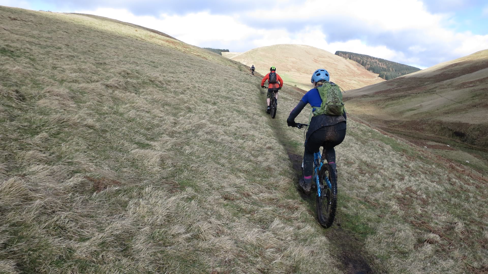 We spin our way up the valley. Colin, one of the Muddybums gang, pops manuals over the bridges as easily as normal riders change gear. At the head of the valley the 4×4 track stops and the fun begins. The trail starts wide, fast and grassy, but as it heads for the right-hand side of the valley it narrows to the correct width for a mountain bike trail and climbs away from the stream. The trail hugs the side of the valley and undulates perfectly to give a good dose of pop and flow to proceedings. There are a couple of narrow sections where a bit of body English is needed to keep your wheels planted on terra firma rather than slipping off the side into the stream (now quite a long way below), but there’s nothing too terrifying and it is lots of fun – what more could you ask for?