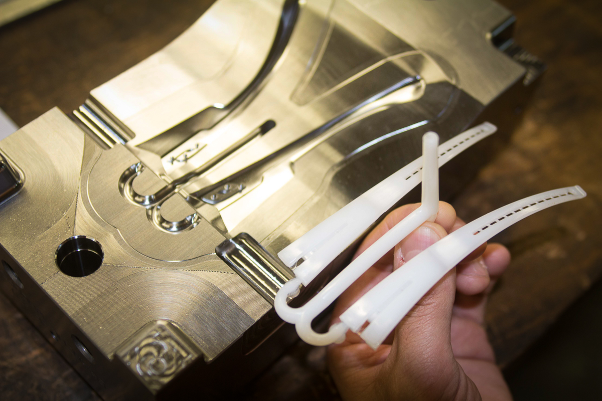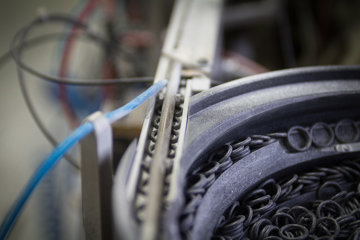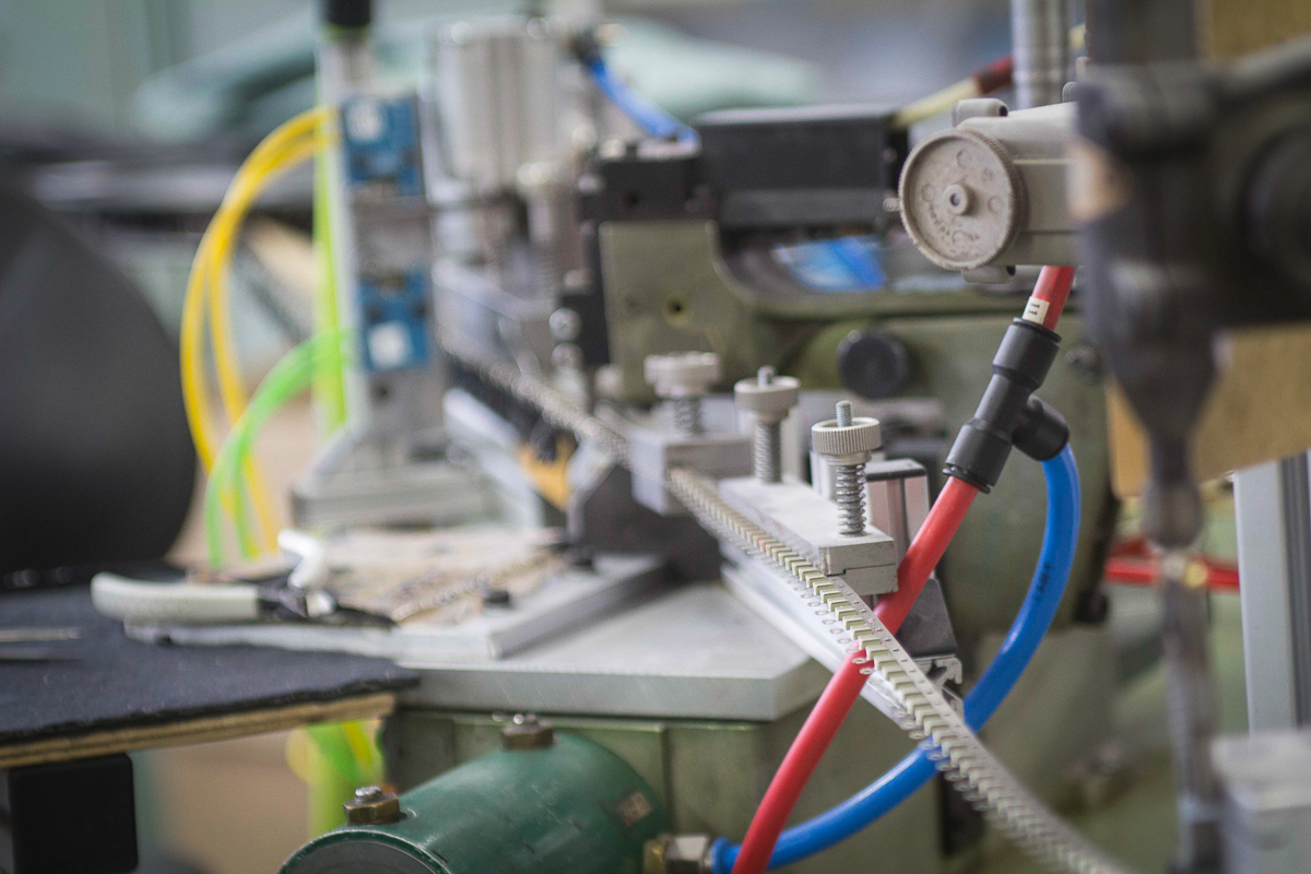 Before we move on towards this despatch area, our attention is drawn to a machine on one side of the plastics workshop. With trails of metal leading into it, around wheels, and into boxes, it looks like the sort of thing that might transport an egg from the fridge, through a cooking process, around your kitchen and onto your plate, with some neatly sliced soldiers on the side and perhaps an ironed newspaper laid out before you. In fact, this machine has been designed and built in house specifically to make the little clips and loops needed for the cords you might use to secure your glasses round your neck (something which is particularly important for some sports such as climbing – these are not like the cords your grandma has to hold her reading glasses). This is the kind of place where problems are identified and solved, even where the solution is as complex as the bespoke building of a whatdyamacallit to make the thingummyjigs.