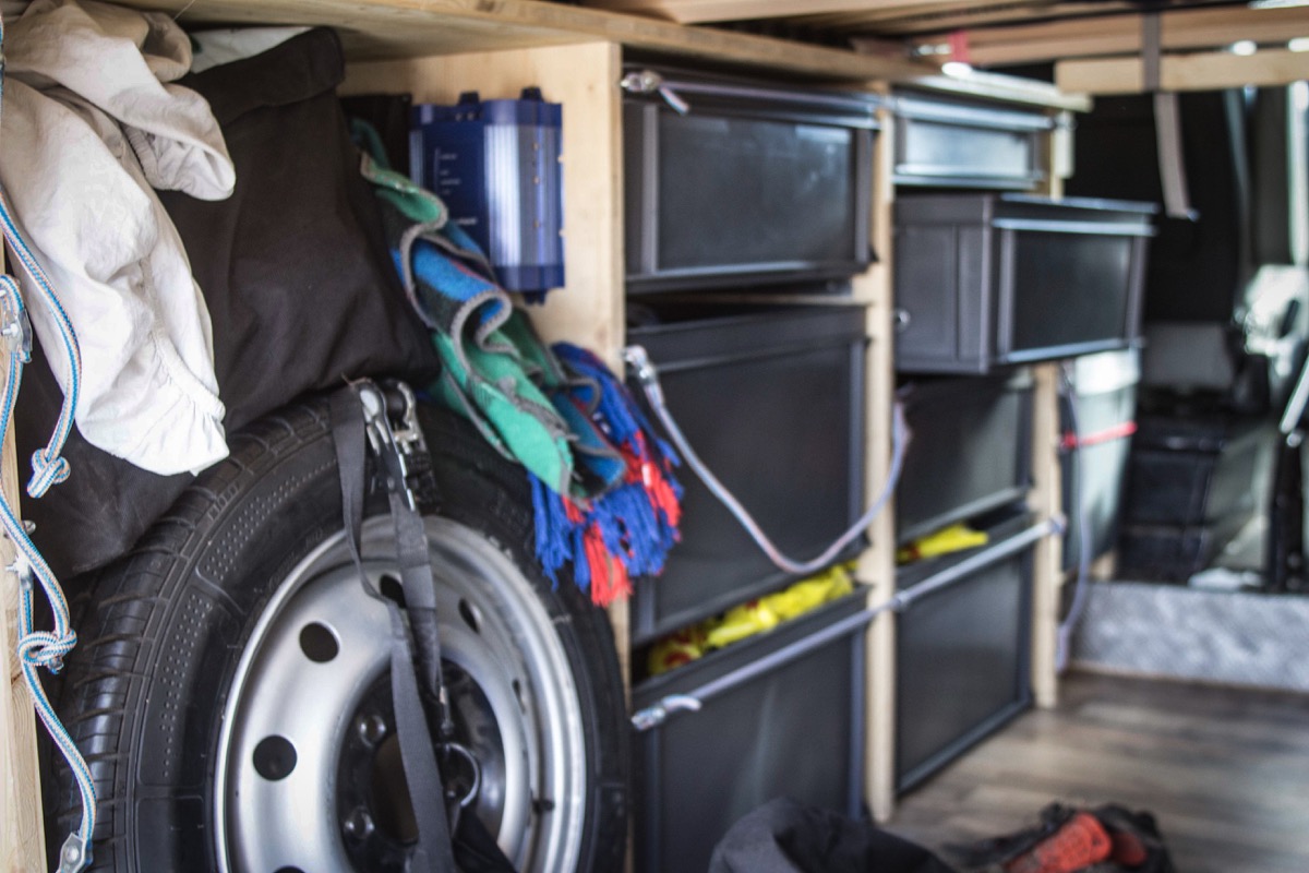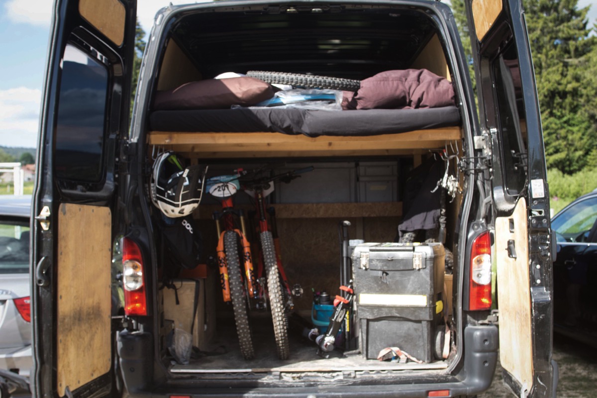 You’ve got to really love each other to live in a van together, but since the Gehrig twins shared a womb they’re probably fairly used to being in a confined space together. With the bed up high, noses not too far from the ceiling – or roof? – this looks a bit too claustrophobic for my liking. But then, if you’ve got to fit twice as much bike related stuff under you, headroom probably goes out the window (actually these two are so tall I should have checked if they have to sleep with their heads out the window). They’re still using the van, but not so much as they did before they turned pro. Privateering and living in a van paid off for them, so they’re not forced to share the restricted space quite so often as in the past.