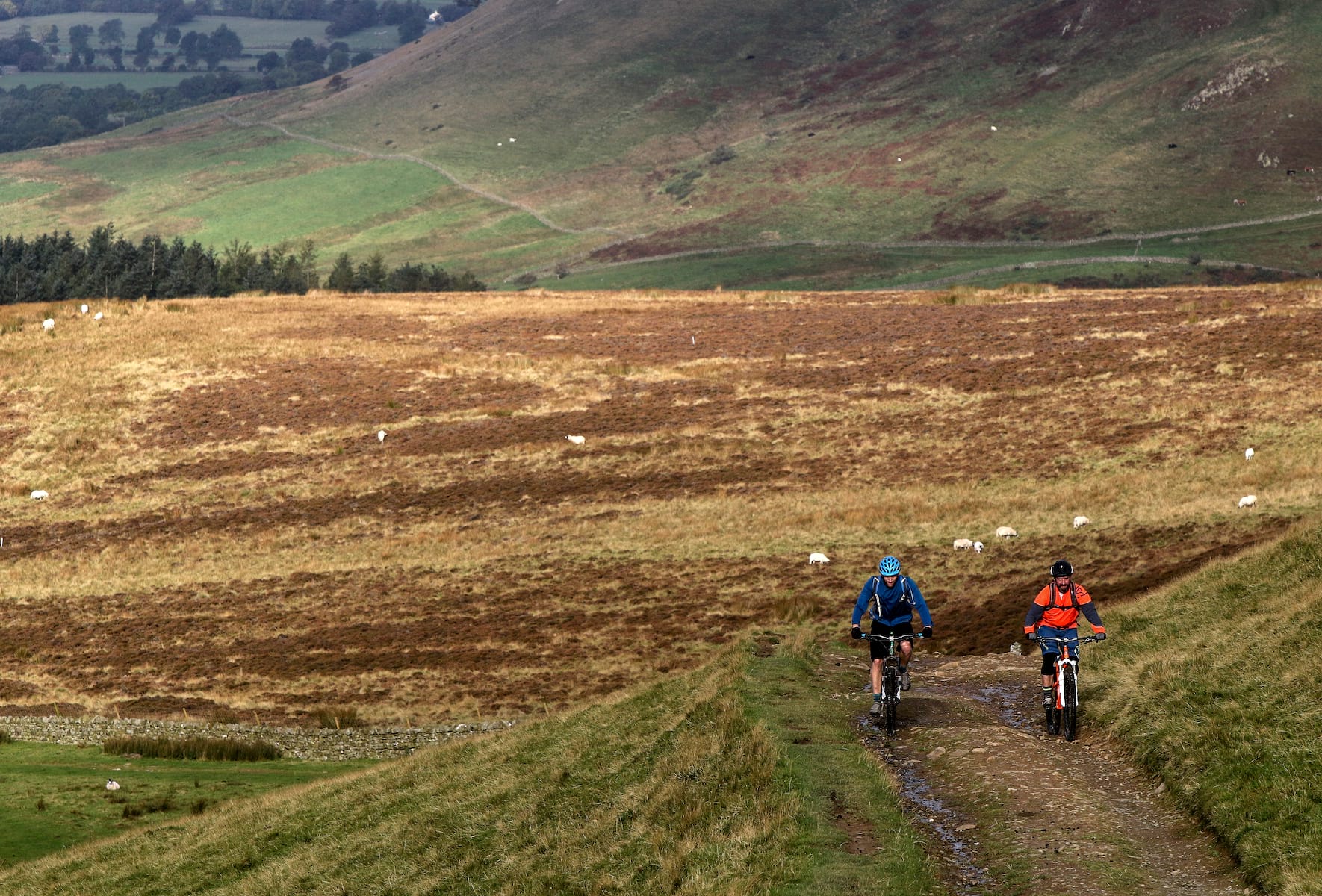 With Andy up and running, the track steepens and John takes off like a rocket. He careers round a wide corner (always fun on damp grass) and shoots off down a bumpy trail. Andy’s up above, taking a photo, and wants us close together but, try as I might, there’s no catching John. I’m at warp speed, but he’s pulling away and the tussocky ground is bouncing me towards disaster. I slow down from ‘terrifying’ to ‘fun’ and watch John hurtle off towards the farmland at the bottom of the fell.