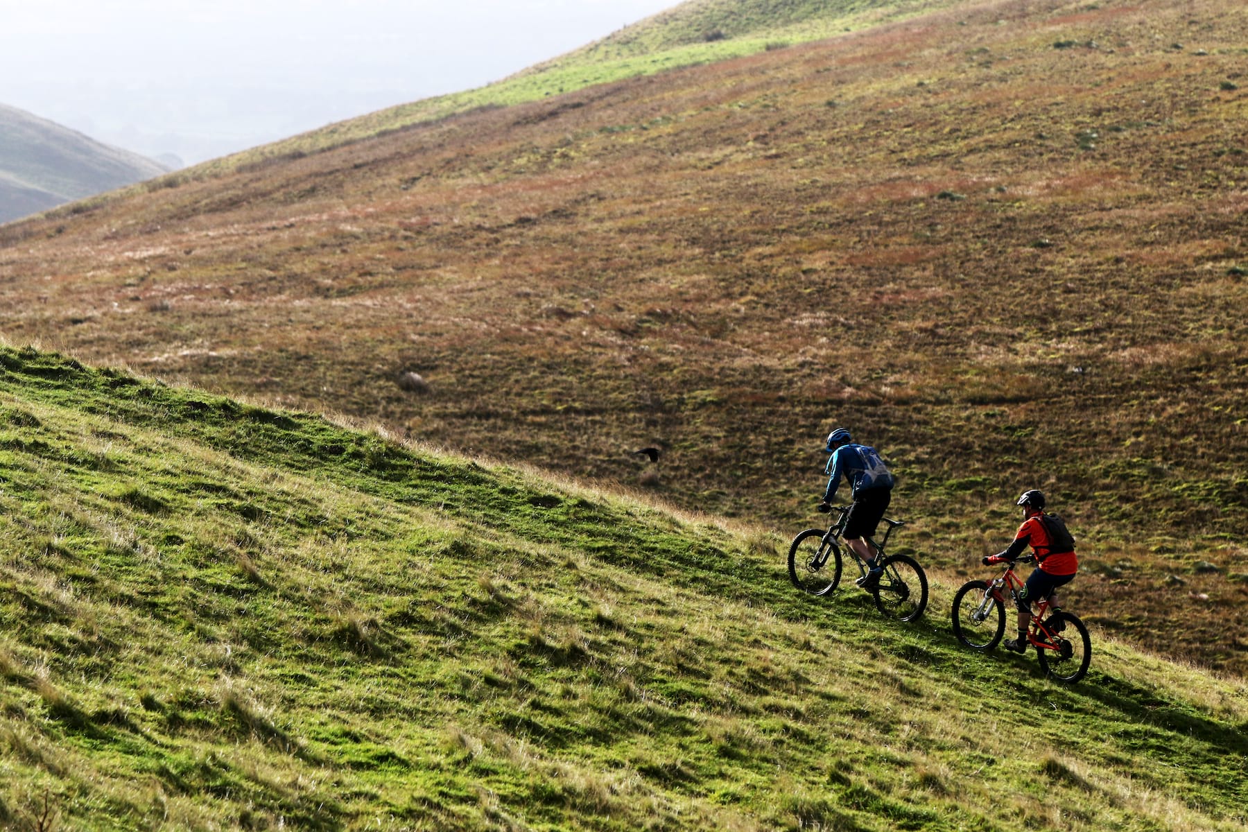 As we descend, the ground gets firmer, the wind drops and we pick up speed. It’s the sort of trail you only get where there isn’t much traffic. A narrow strip of short grass among the reeds, it’s a wide sheep track, a barely visible trail seeking the easiest route through the tussocks and banks. It’s about as far removed from a fast and flowing trail-centre descent as you can get but, sweeping down behind Andy, following his lines here, taking alternate ones there, it’s just as much fun.
