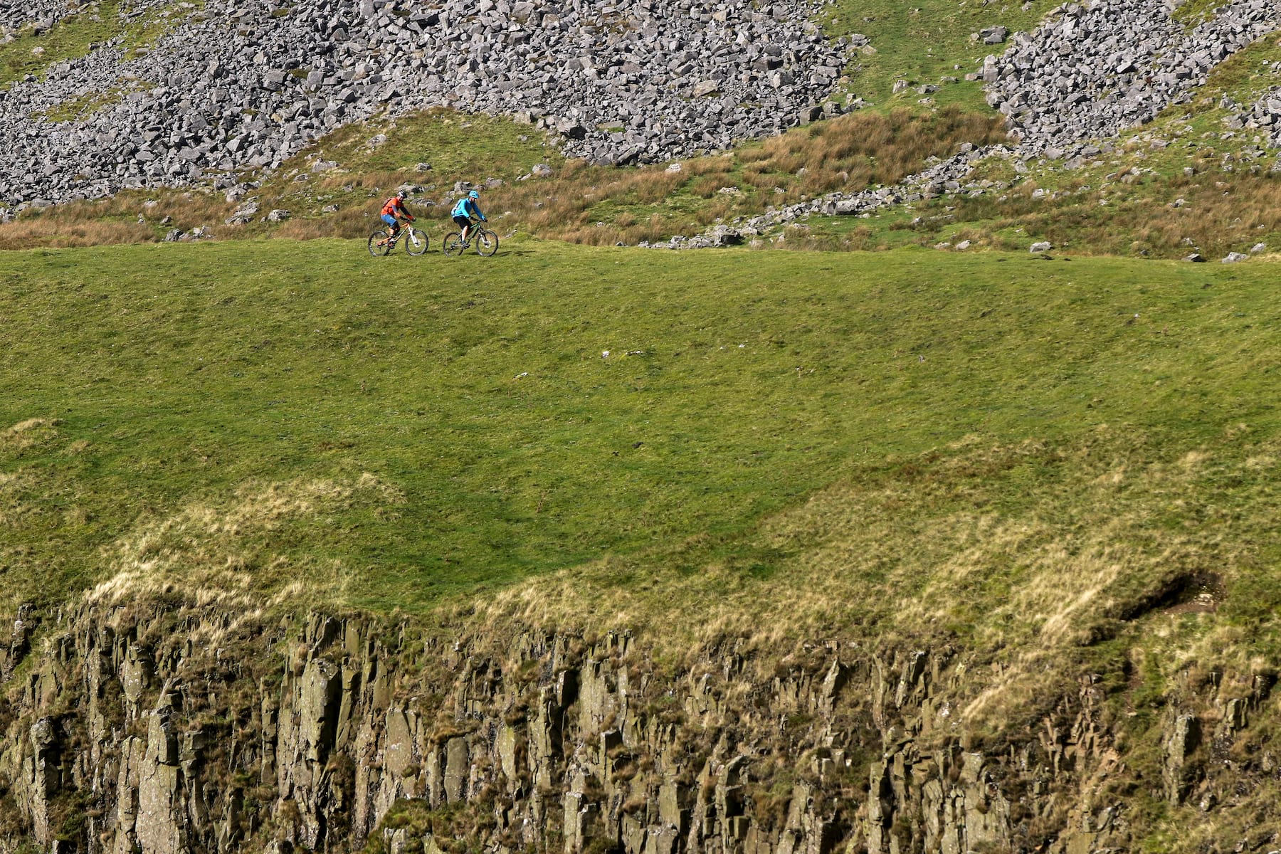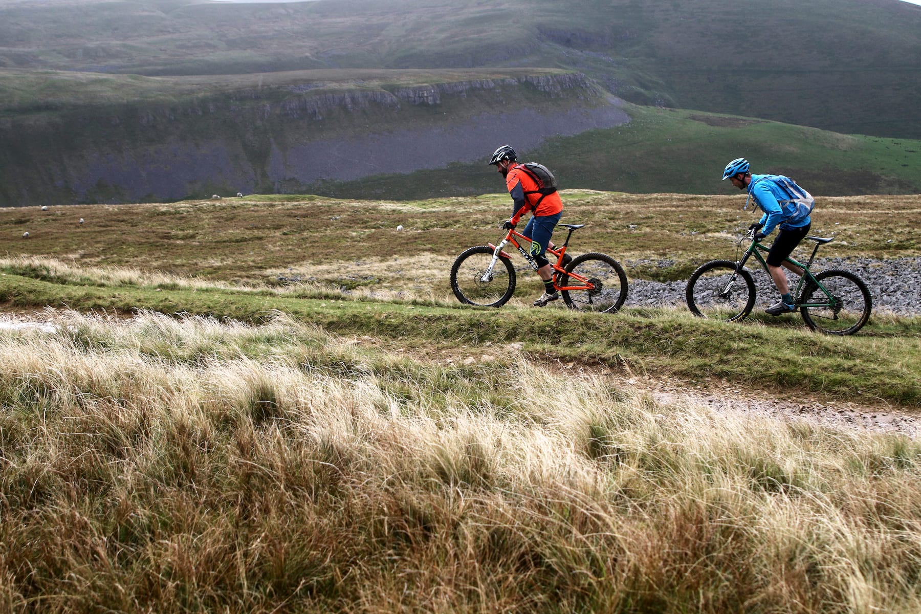They get a fairly typical introduction to the area. After a short spin out of Dufton, we’re straight into the 400-metre climb to High Cup Nick. Still, as climbs go, it’s a good one. The first couple of hundred metres are gained quickly, though not particularly easily, on farm tracks. It’s far from technical, but does get steep. And if you find you need a quick breather, just stop, turn around and pretend you’re admiring the view, which stretches to the Lake District. It’s a good excuse, and one I need, because Andy powers off at pace, leaving John and me trailing in his wake. Coming over a small rise, he’s put so much distance into us that he’s had time to stop, remove a layer and get back on his bike before we’ve caught up. Pretty embarrassing.