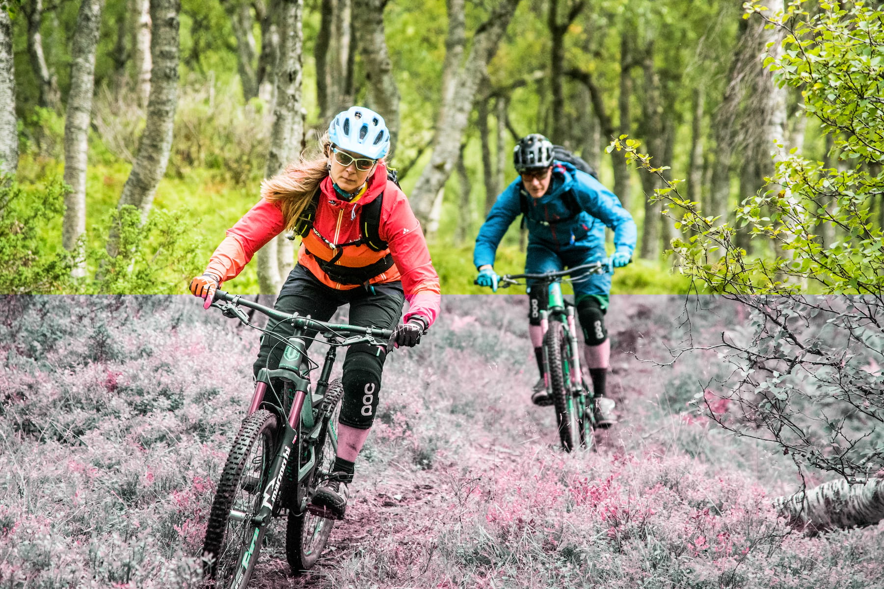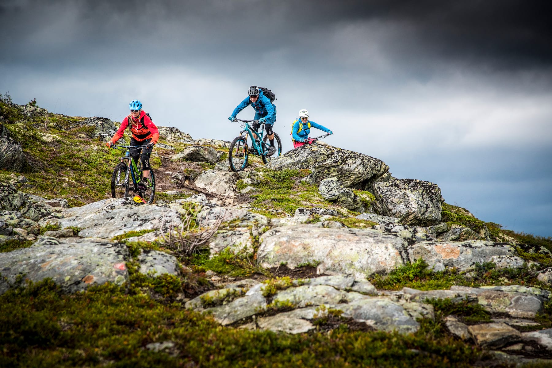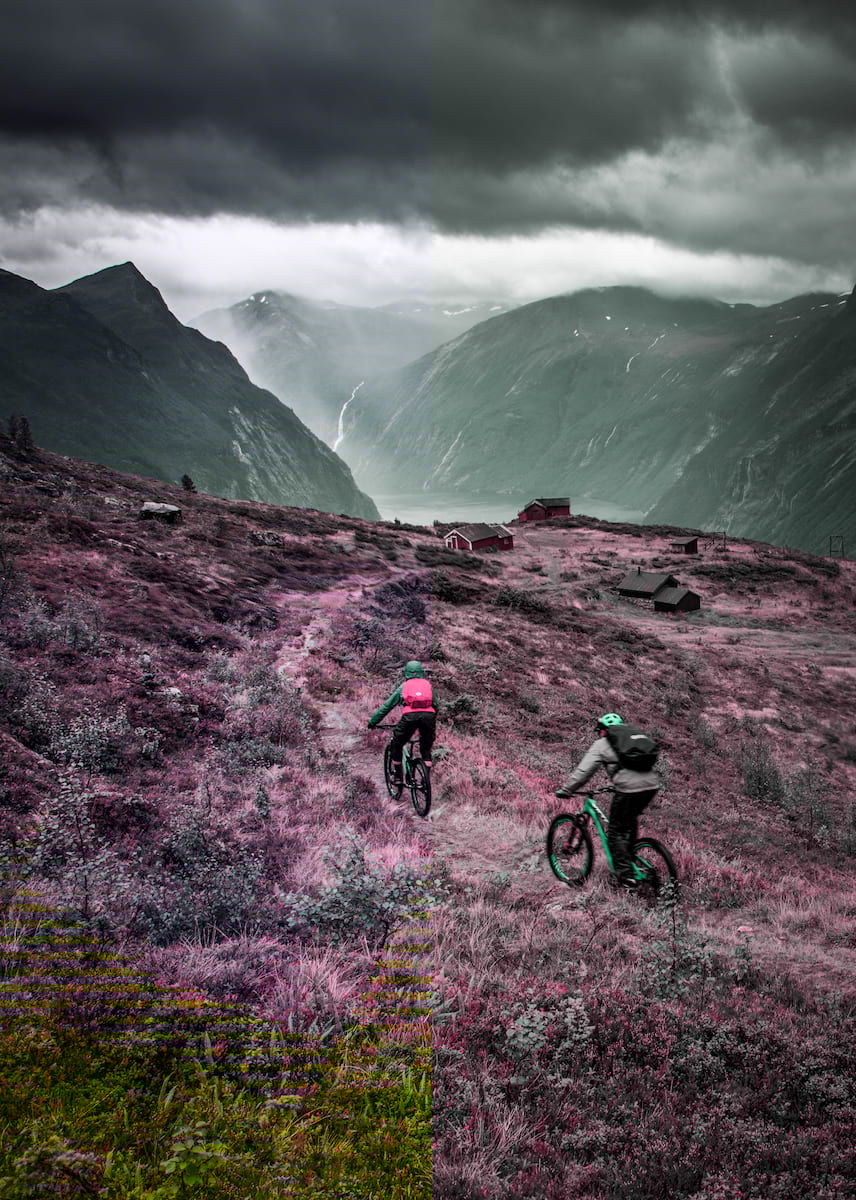 A rocky ribbon unfurls through the green and orange splatter-painted hobbit landscape before it disappears and the grippy ridge morphs into a rumble strip of shark fins and mud. At a junction, we pass a doubletrack ride-around and veer off on what our Norwegian guide calls the ‘normal route’. We negotiate a bramble-covered rock slab that ends with a traverse on slick mud that’s hard to imagine being able to ride ever. I’m wishing I brought a rope and climbing harness.