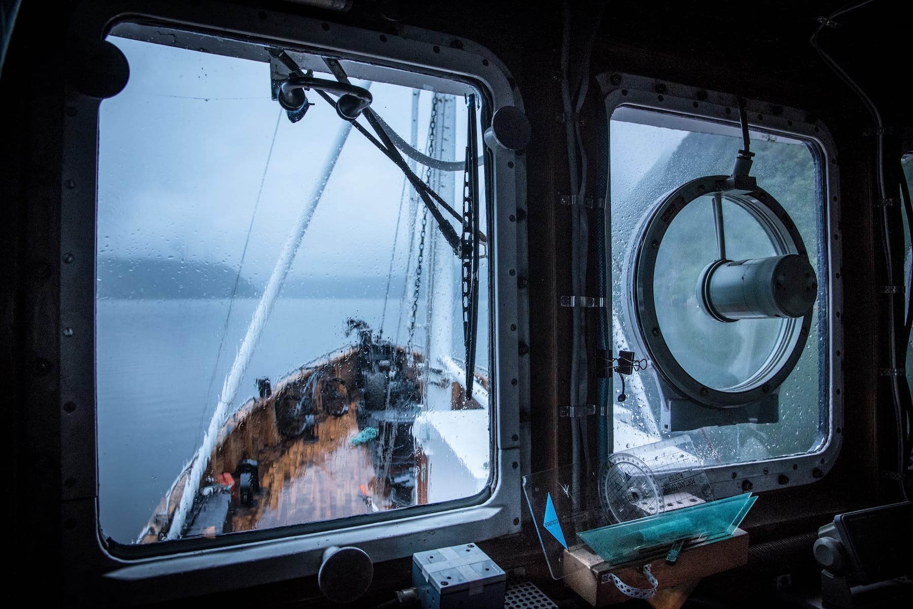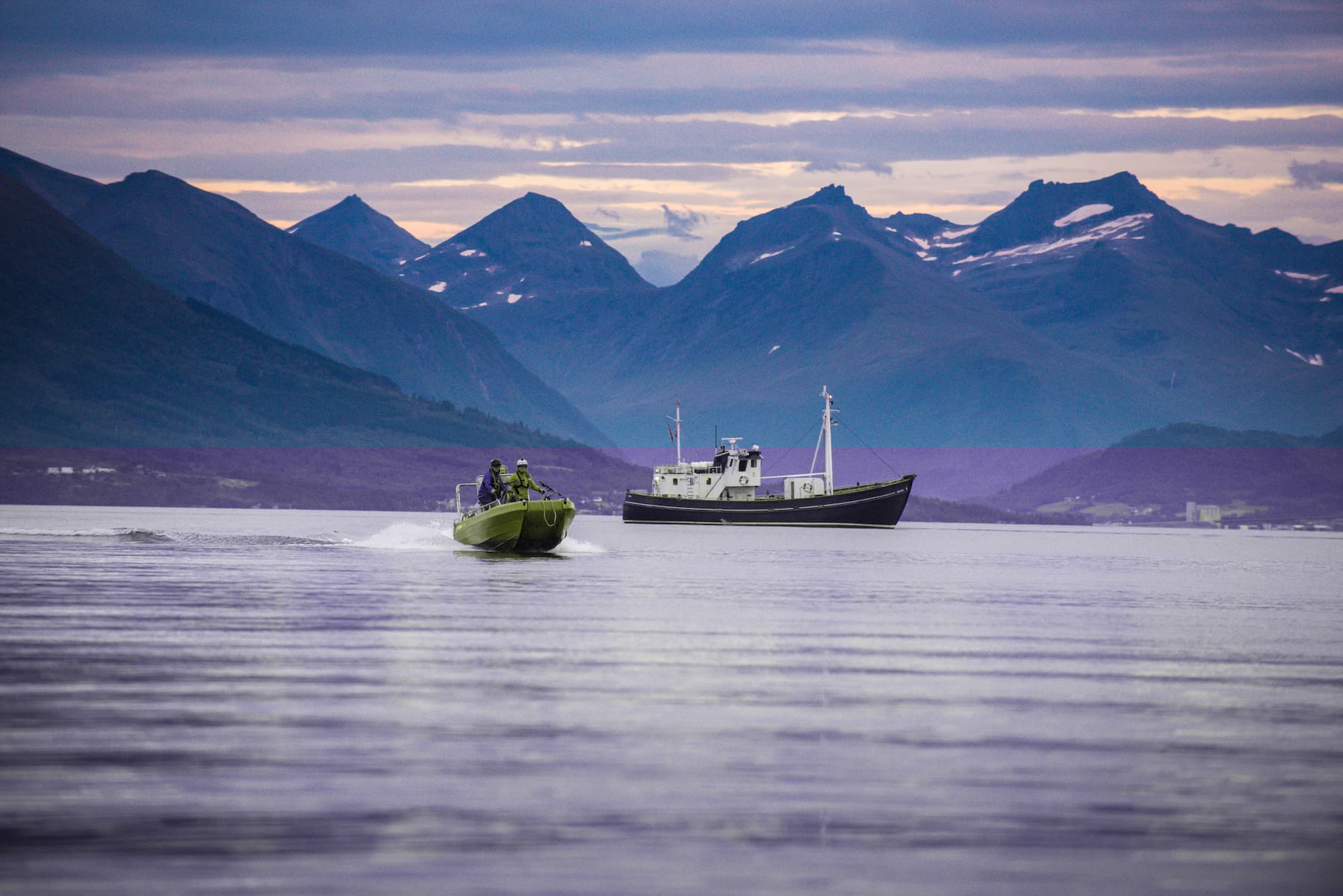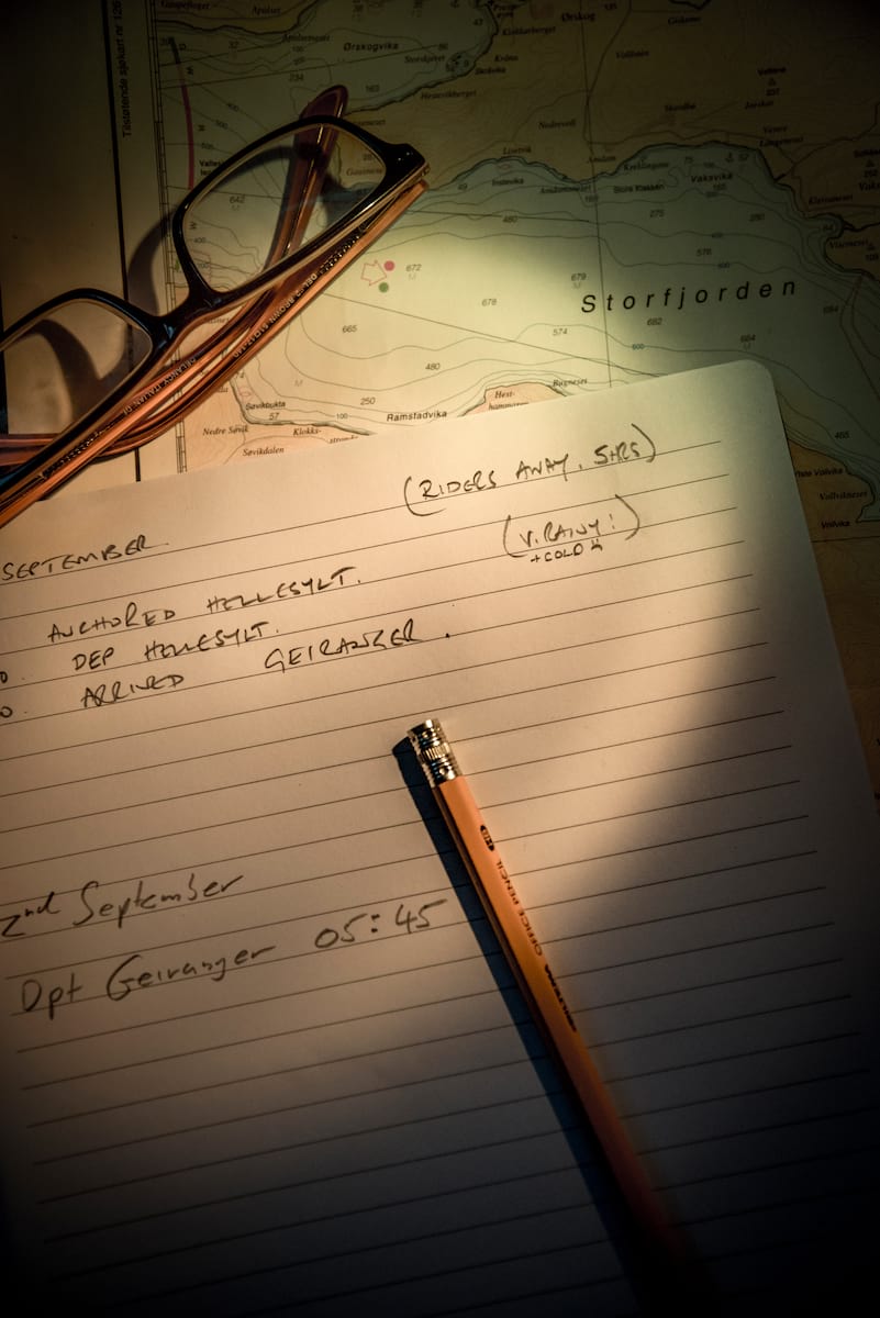 Our trusty ship, the Gåssten, provides respite. Between plodding climbs and slick descents, we sleep, eat and plot our course in the Admiral’s lounge aboard this five-cabin retired navy ship. For a small boat, the Gåssten is spacious. Below deck, she has cabins to sleep twelve guests plus three to four crew, a dark wood-panelled state room, a steamy engine room perfect for dying gear and two full bathrooms. Above deck, a kitchen and galley give access to the cluttered pilothouse. In fair weather, we hang out at a picnic table on deck or climb a ladder to the top of the pilothouse for the best view of the fjords.