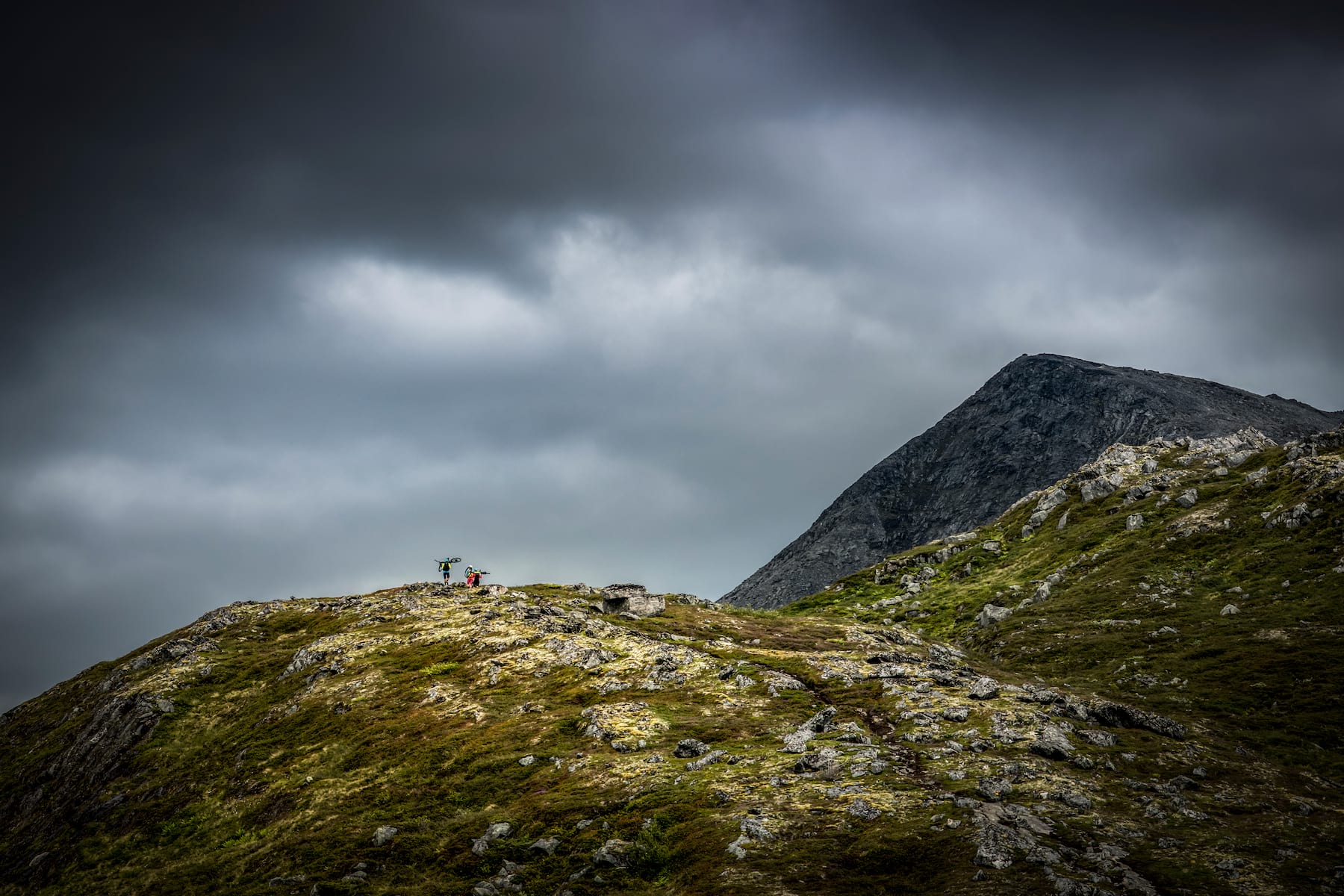 I’ve been slogging uphill for an hour and a half, my mountain bike on my back, and the summit cairn isn’t getting closer. The trails in Norway’s Sunnmøre Alps aren’t uphill rideable, so four of us – an American, two Scots, and one Norwegian, ‘pushbike’. Steep, jagged slopes, some a volcanic grey, others an eerie green, shear off into the narrow fjords below. We sink to our ankles on the boggy trail with each step – then clamber onto slick, uneven granite hogbacks.