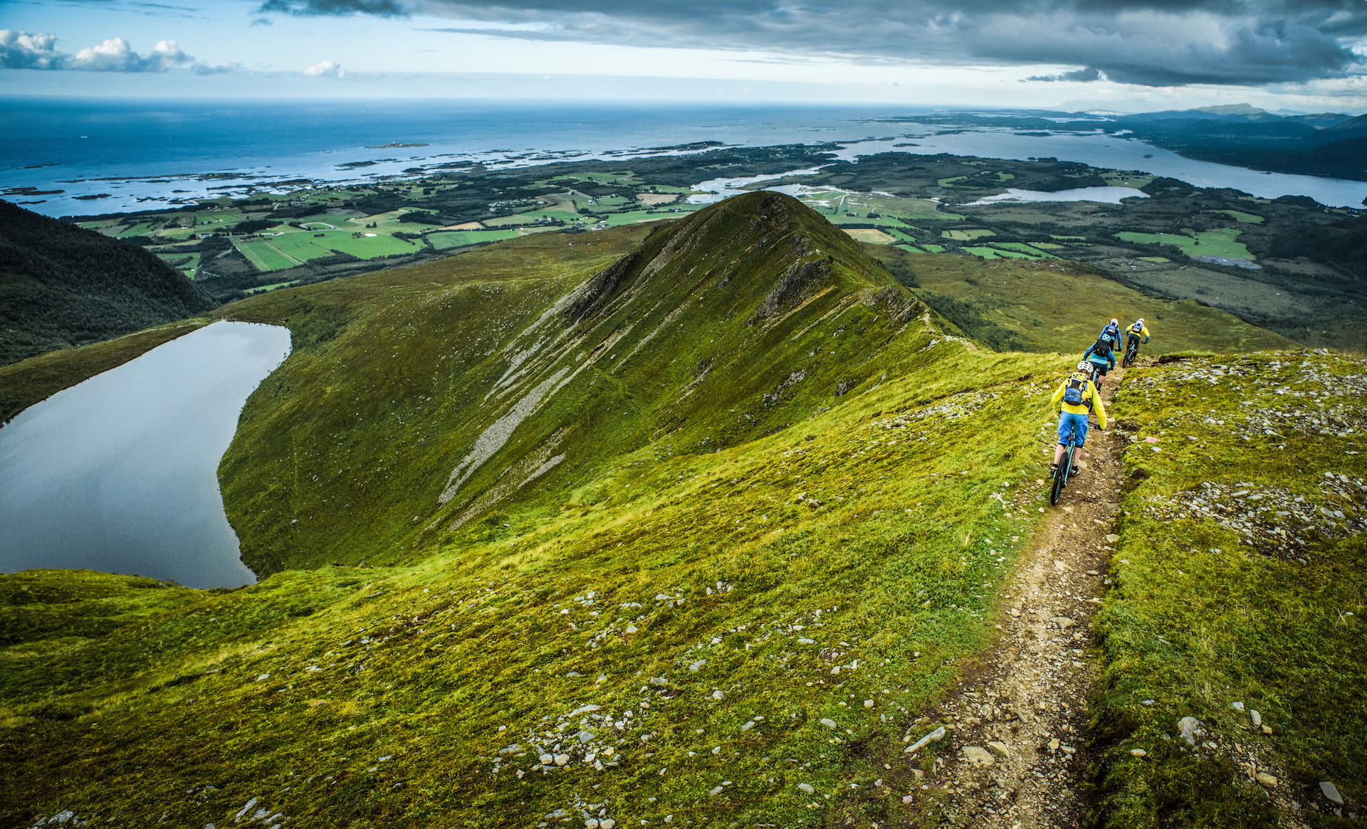 The rocky spine we’re riding rises and dips through stunted, marshy arctic sedges glowing gold in the afternoon light. We skirt a high alpine pond and crank across a natural pump-track I’d swear was purpose built if it wasn’t so remote. Across the fjord, Ålesund, famous for its art nouveau buildings and cod fishing fleet, is clustered behind a sturdy breakwater. Ferries heading to and from the city bisect the silvery Atlantic below. We bang a left and pop out into someone’s garden wearing grins of exhilaration and relief.