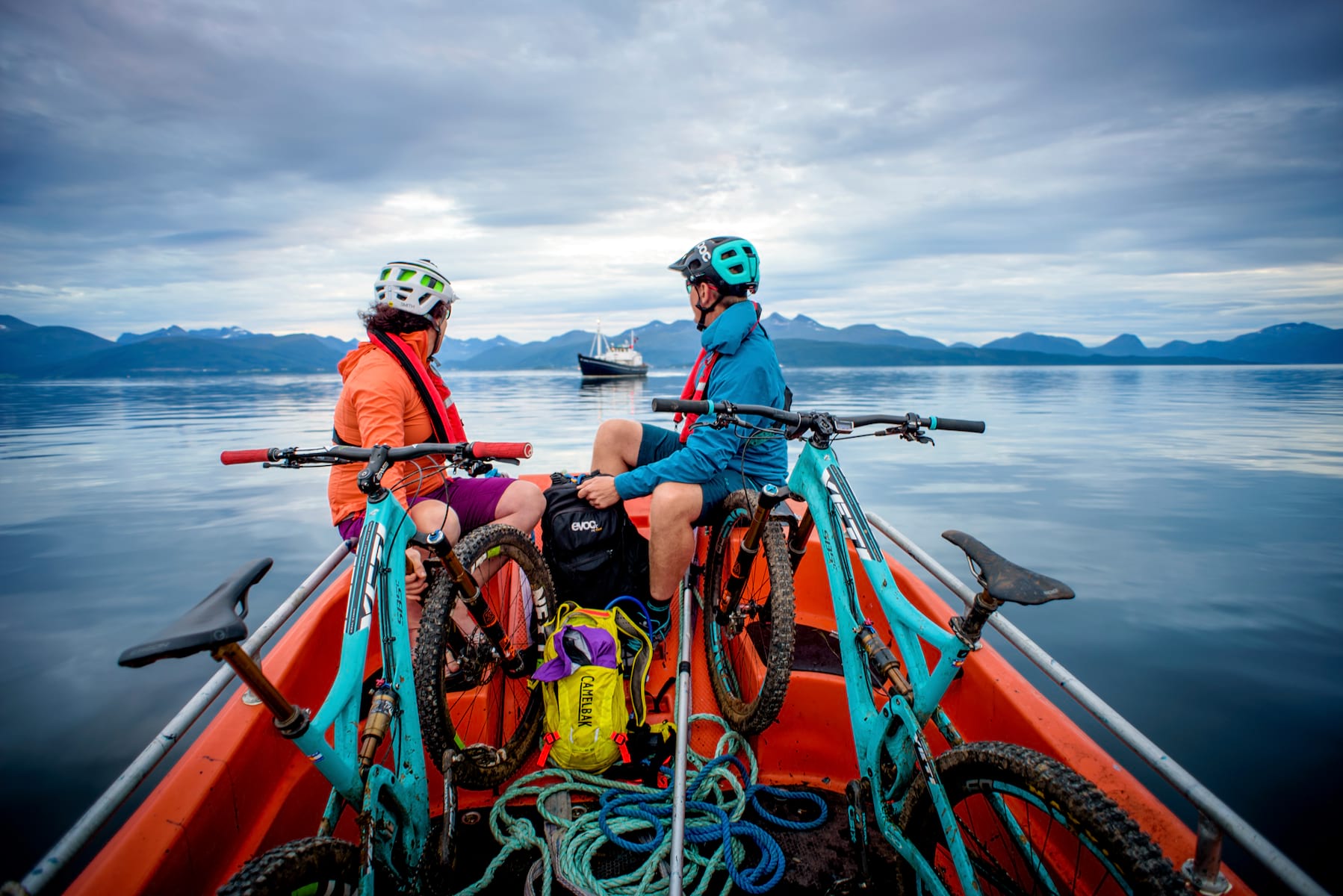 Today, after doing a first rinse of bikes, gear and bodies with a dock hose, we bolt for hot showers, then hunker down in the galley for afternoon tea. Chef Izzy has prepared home-made cookies and breads, served along with nuts, crisps, tea and beer. We snack, chat, nap and read until Izzy kicks us out to set the table for dinner: reindeer stew with lingonberries, salmon wrapped in pastry, and white chocolate crème brulée with fat ripe raspberries. After a five-star meal and several glasses of red wine, all I remember about the day is the awesomeness of the scenery and the thrill of the steep descent. Then, with bikes strapped to Gåssten’s wooden gunwales and Captain Sven Stewart at the helm, we cast off to steam through the night.