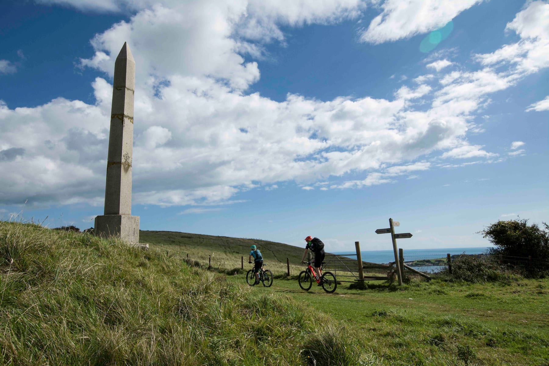 Ballard Down isn’t quite as high as Nine Barrow Down, but the clamber up onto it is notably steeper and on a less forgiving surface too. I could see the relief on Sean and Steph’s faces when I suggested we stopped for some pictures at the monument at the top. The sky and sea to the south provided a cheery blue background to the pictures, but that streak of grey approaching from the north was definitely getting a lot closer now and any thoughts we had of shooting sunny pictures of the white chalk cliffs of Old Harry were definitely forgotten.