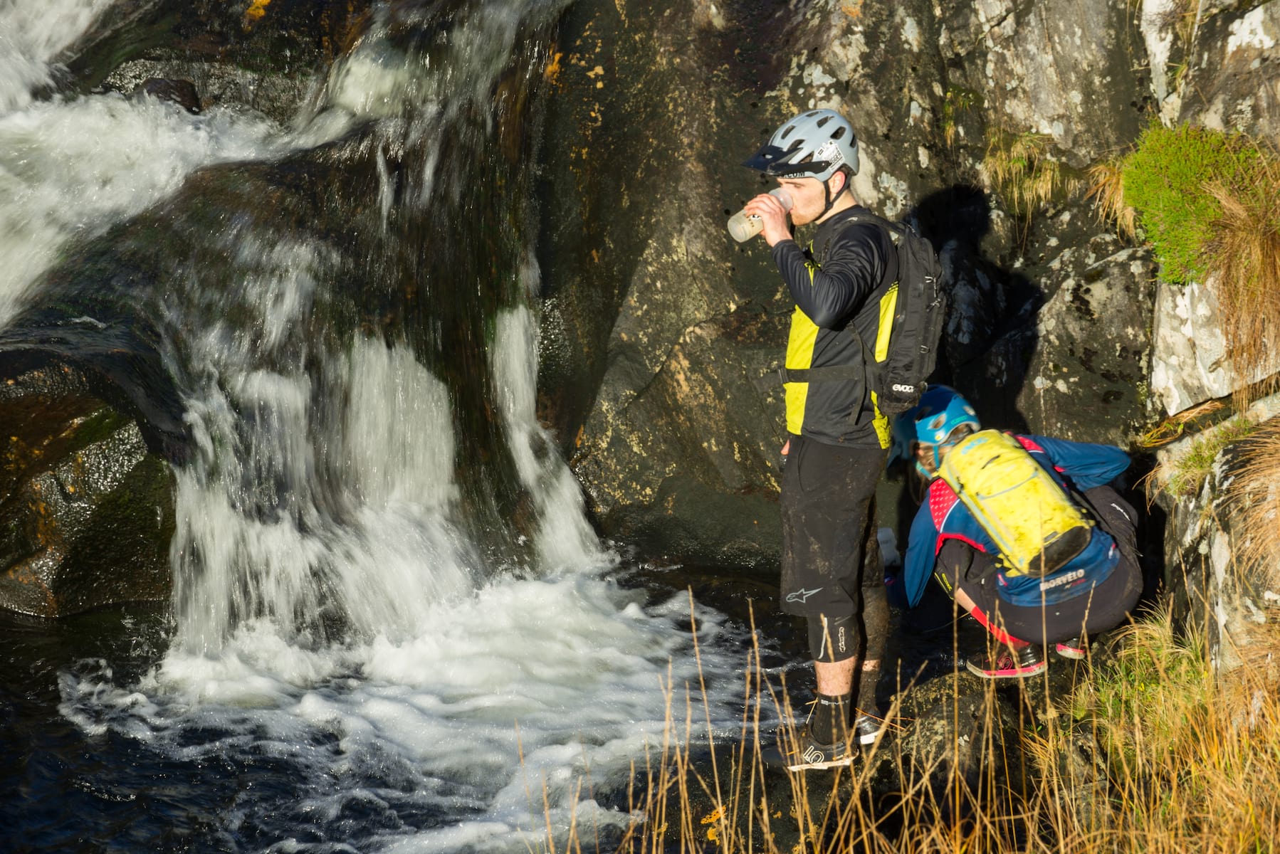 After the best part of an hour fighting the lack of grip and the bike’s tendency to do anything without severity, the path flattens as it meets the drove road from Arnisdale and the sogginess kicks up a couple of notches. We pause to refill water bottles and inhale sweeties next to a rather fetching waterfall, and wonder at the height we’ve still to lose despite what we’ve just endured.