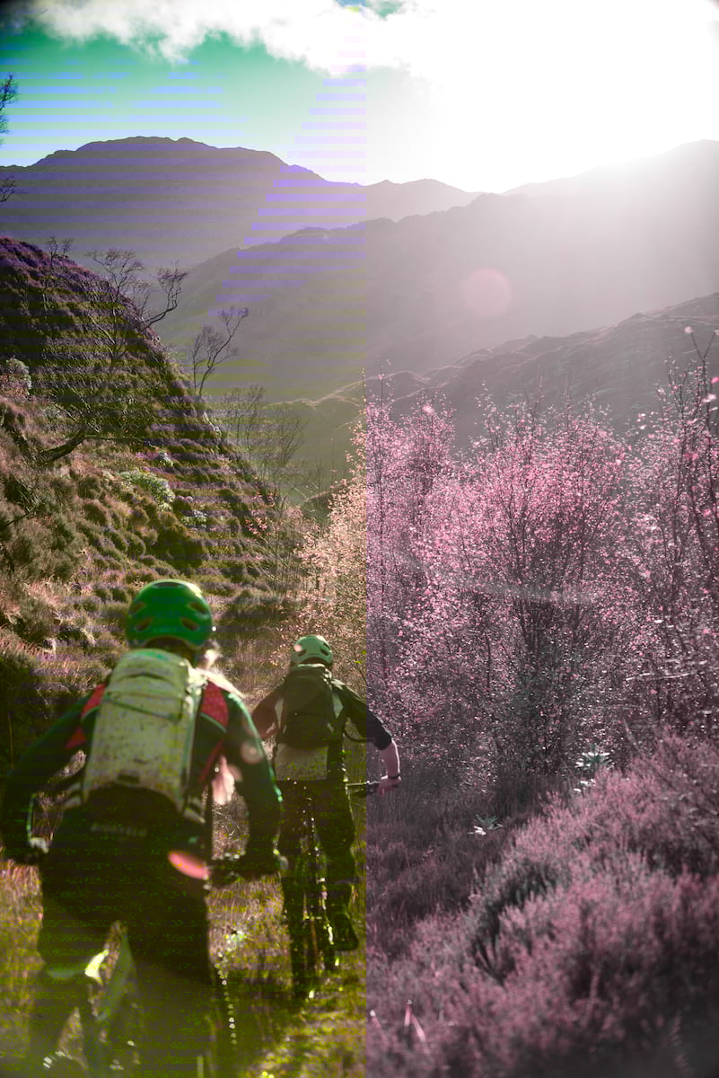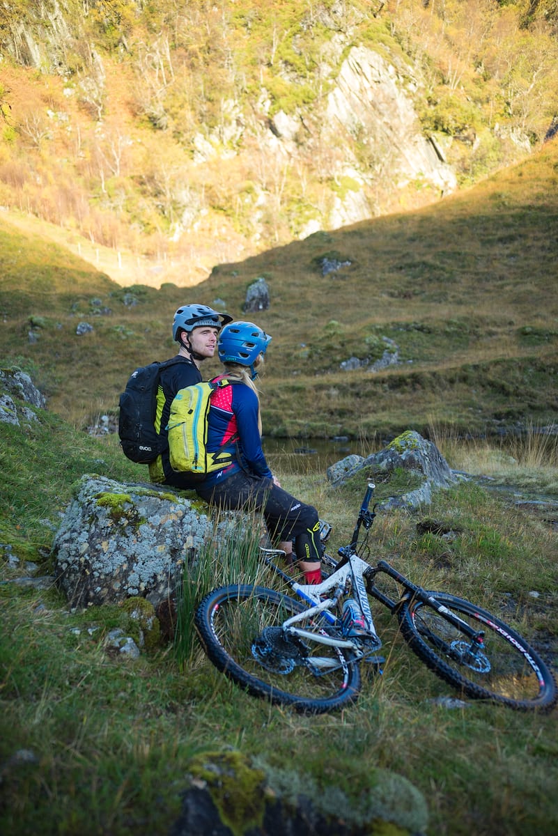 Every time we stop to regroup, the smiles get wider. Slick rock slabs give no indication of their slimy nature. Wet grass grips and then gives way; gravel no longer the predictable material we’d become so used to. Getting down the upper slopes is a case of hold on, go floppy and let the bike do what it needs to do, knowing we just need to keep pointing front wheels vaguely in the right direction and we’ll generally be OK.