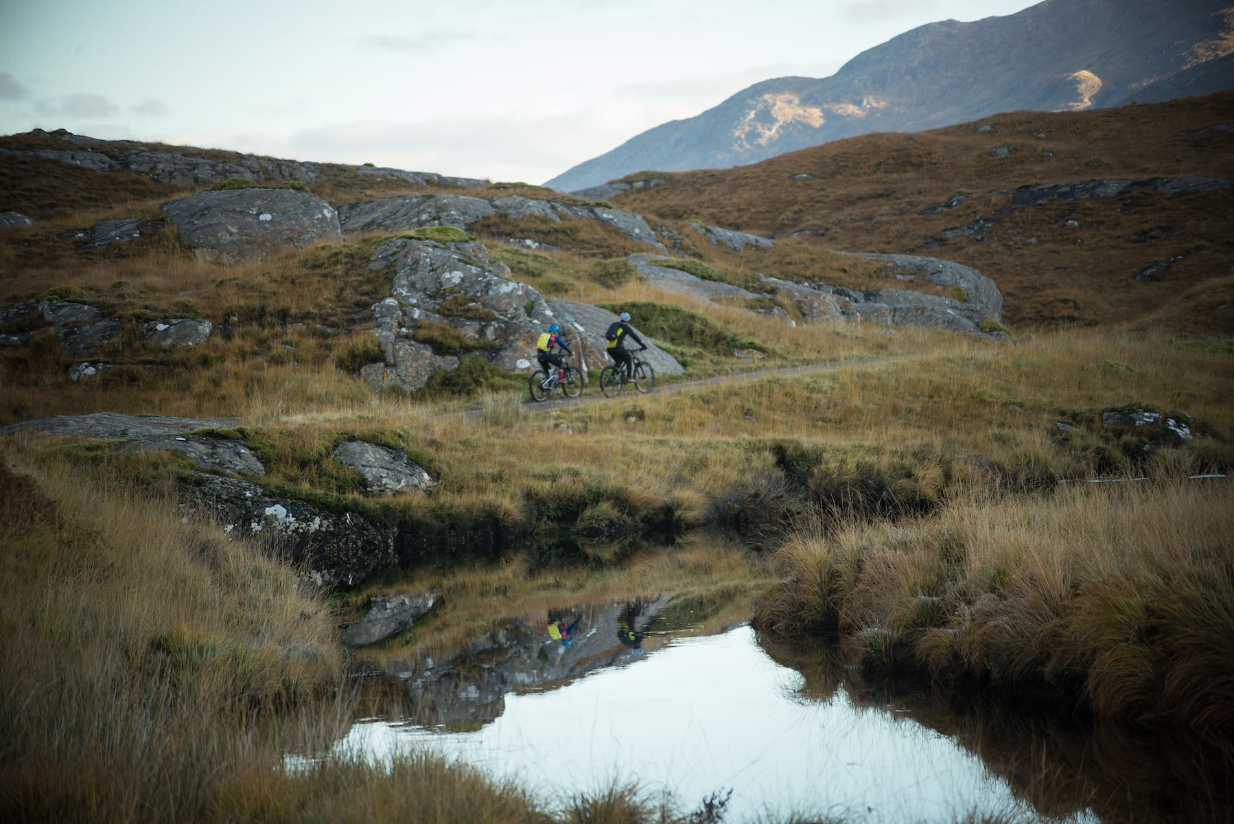 Fast forward to late 2017 and the inky darkness of night starts to give way to the pale hues of morning as we dodge suicidal blackbirds along the old Skye Road past Tomdoun. As we reach the Glen Quoich dam, deer and Highland cattle throng the road and the pace slows as the morning starts to make itself known. Beyond Loch Quoich bridge, along with local Fort William pinners Miles Mallinson and Mikayla Parton, I saddle up for the spin into the middle of nowhere.