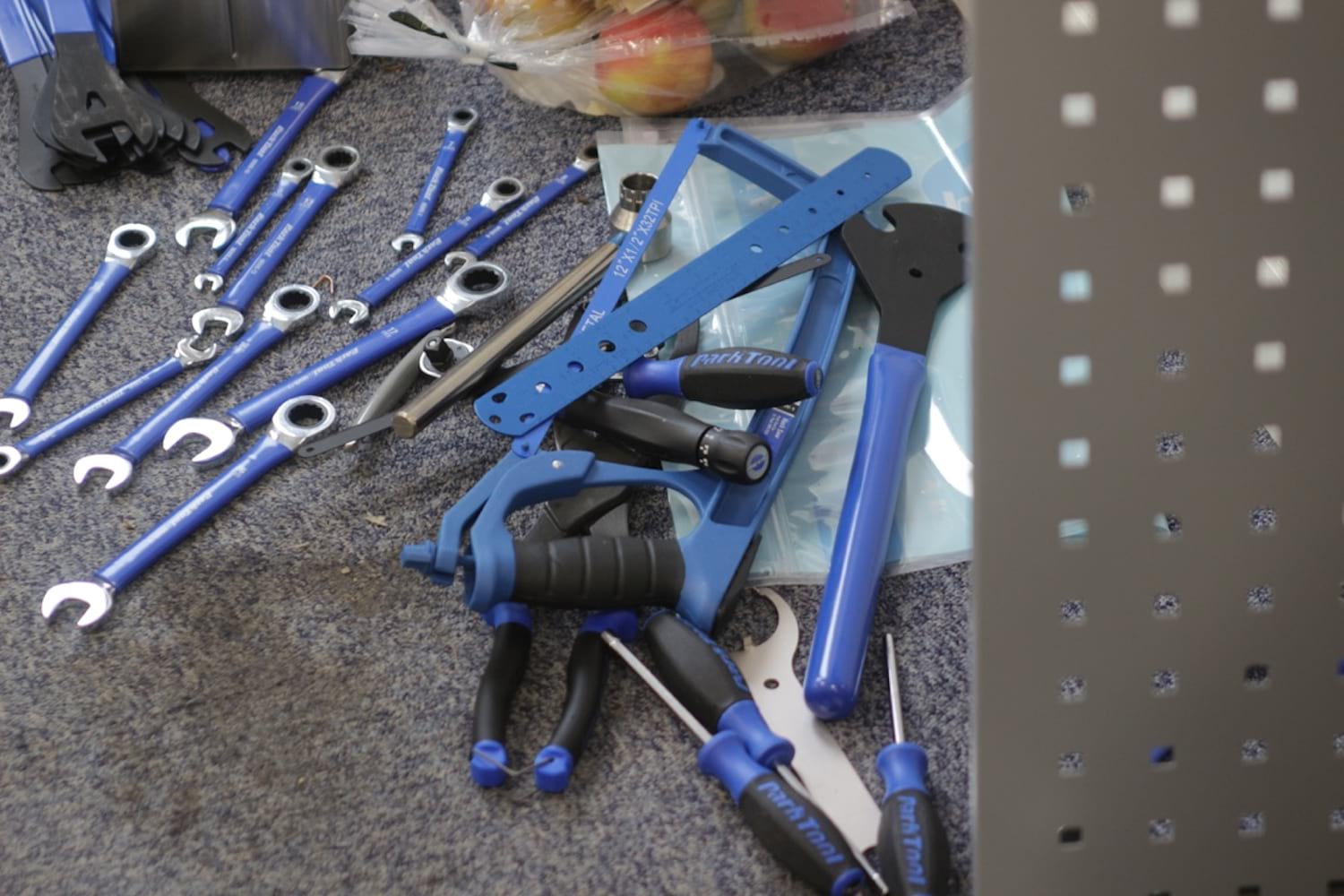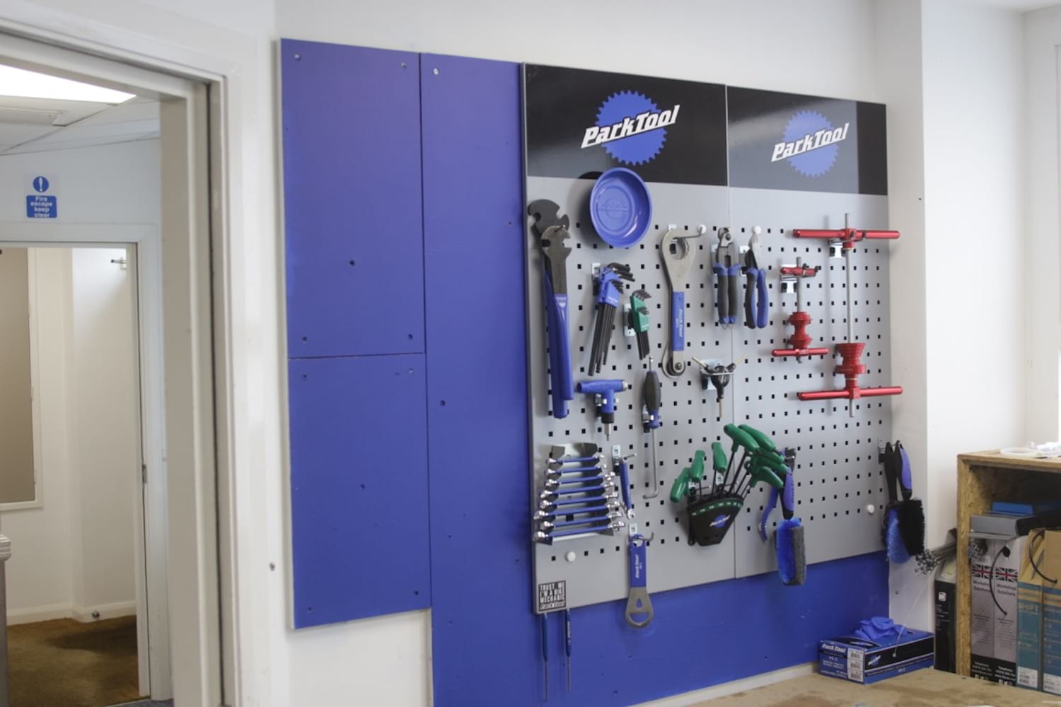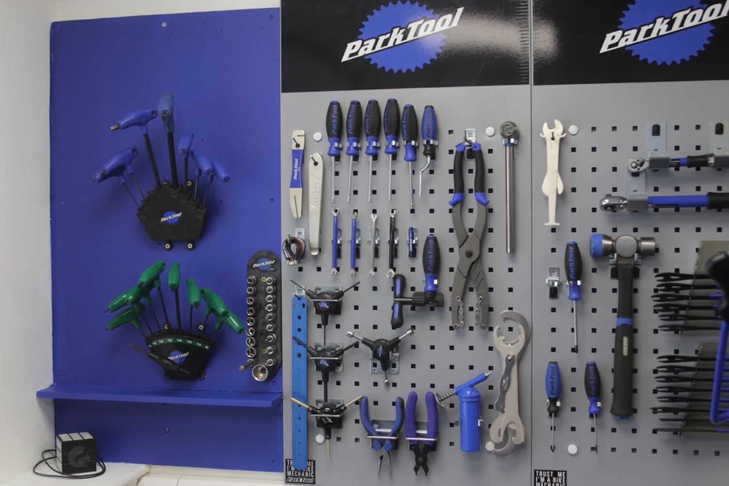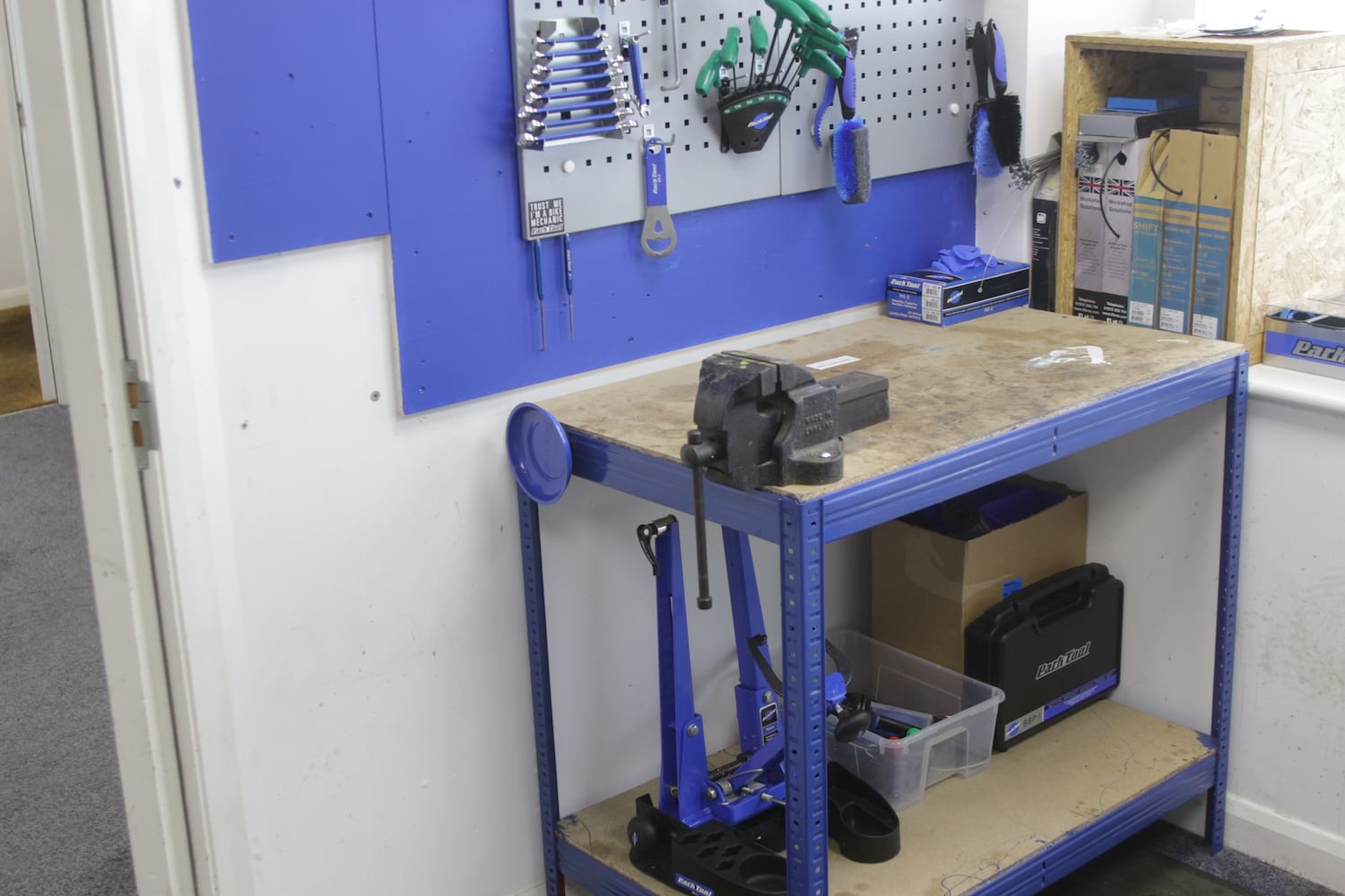 Our workbench also got the blue paint treatment, before being stocked with a new wheel truing stand, and even some Park Tool gloves in matching blue.
