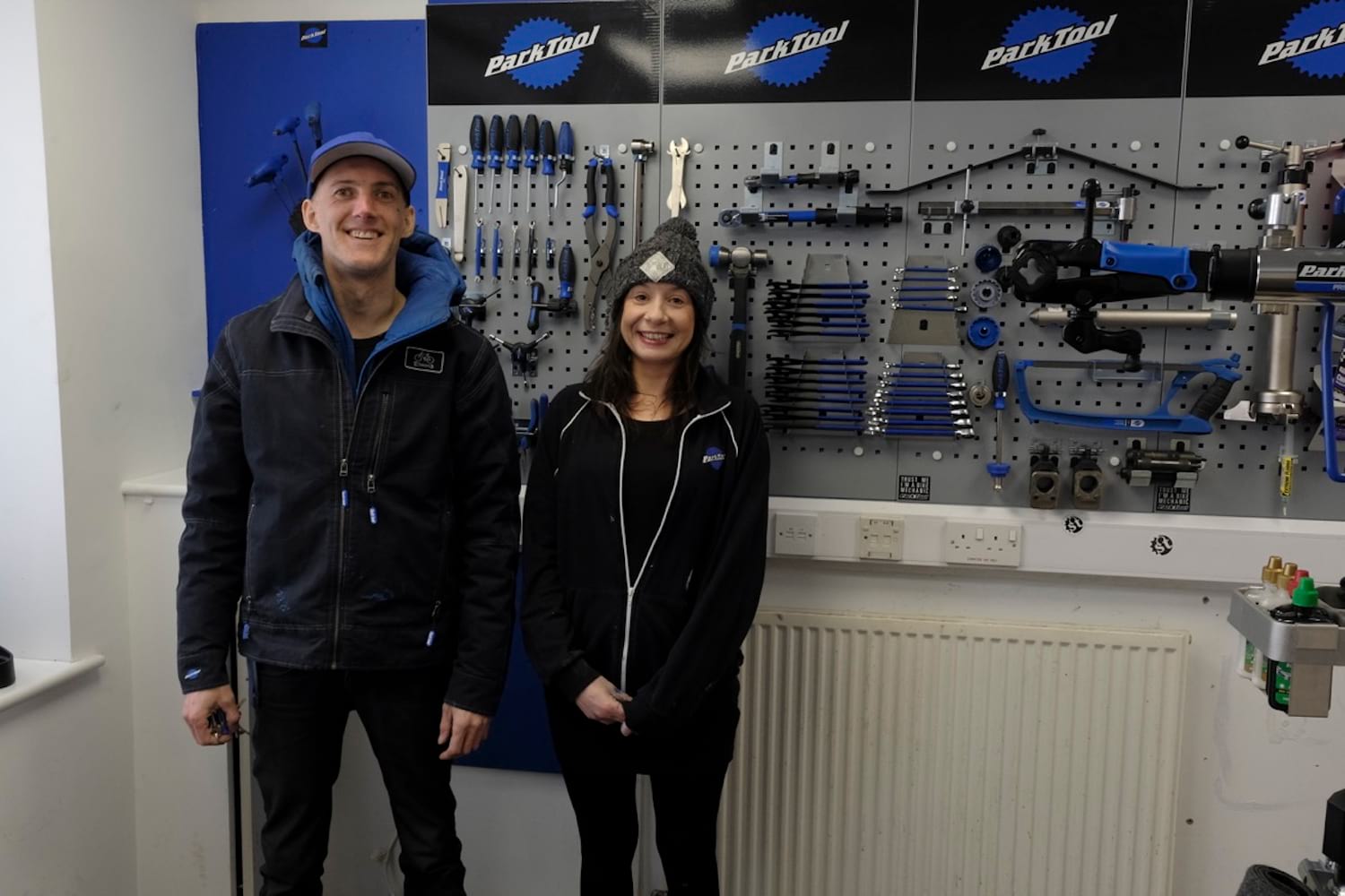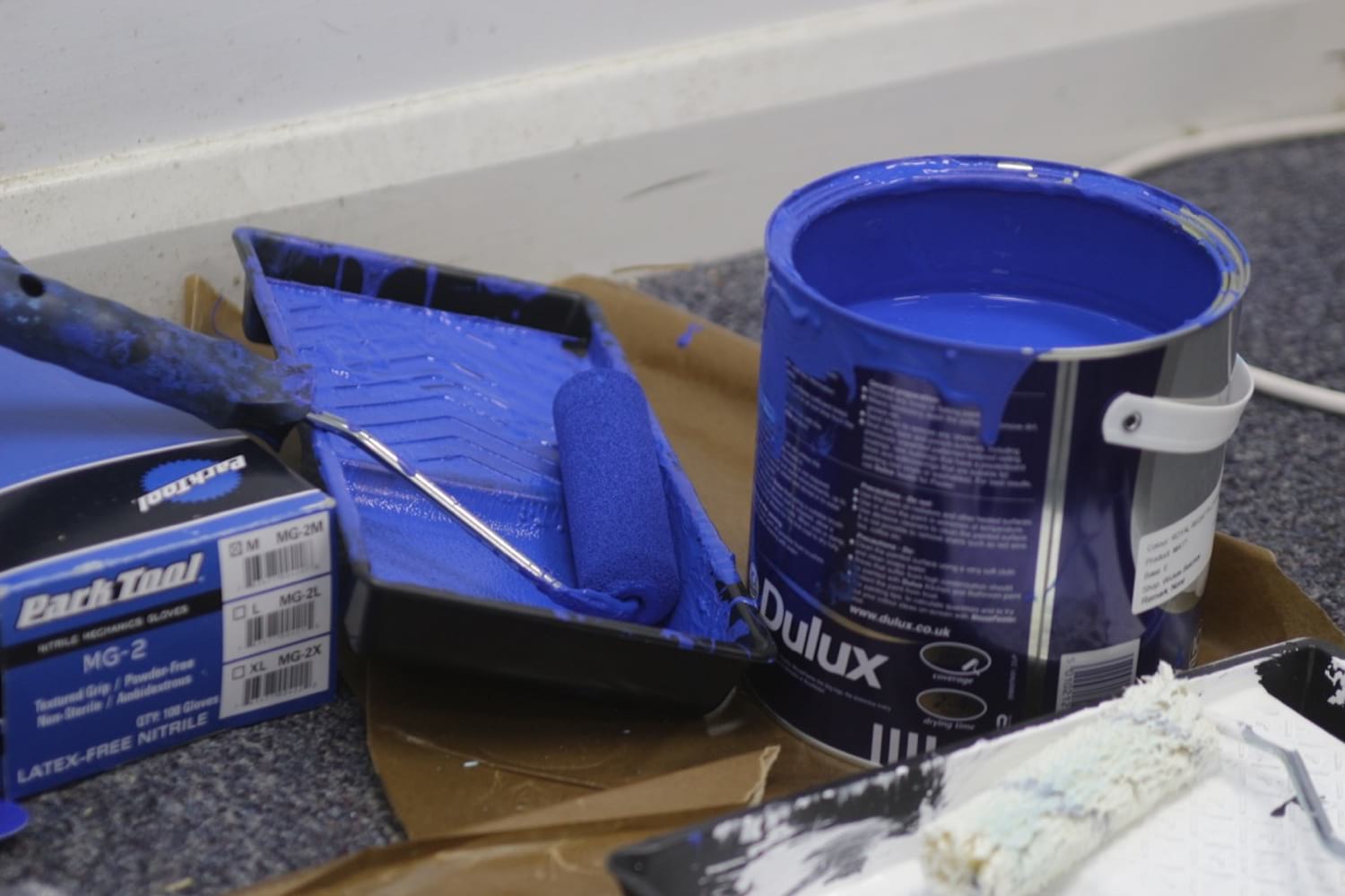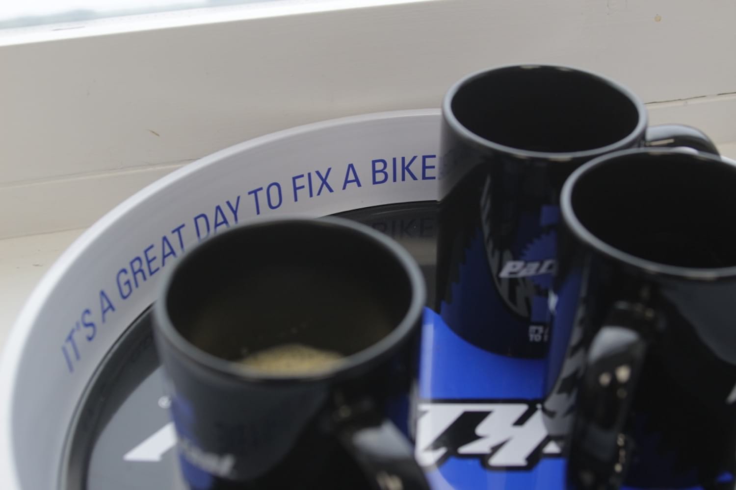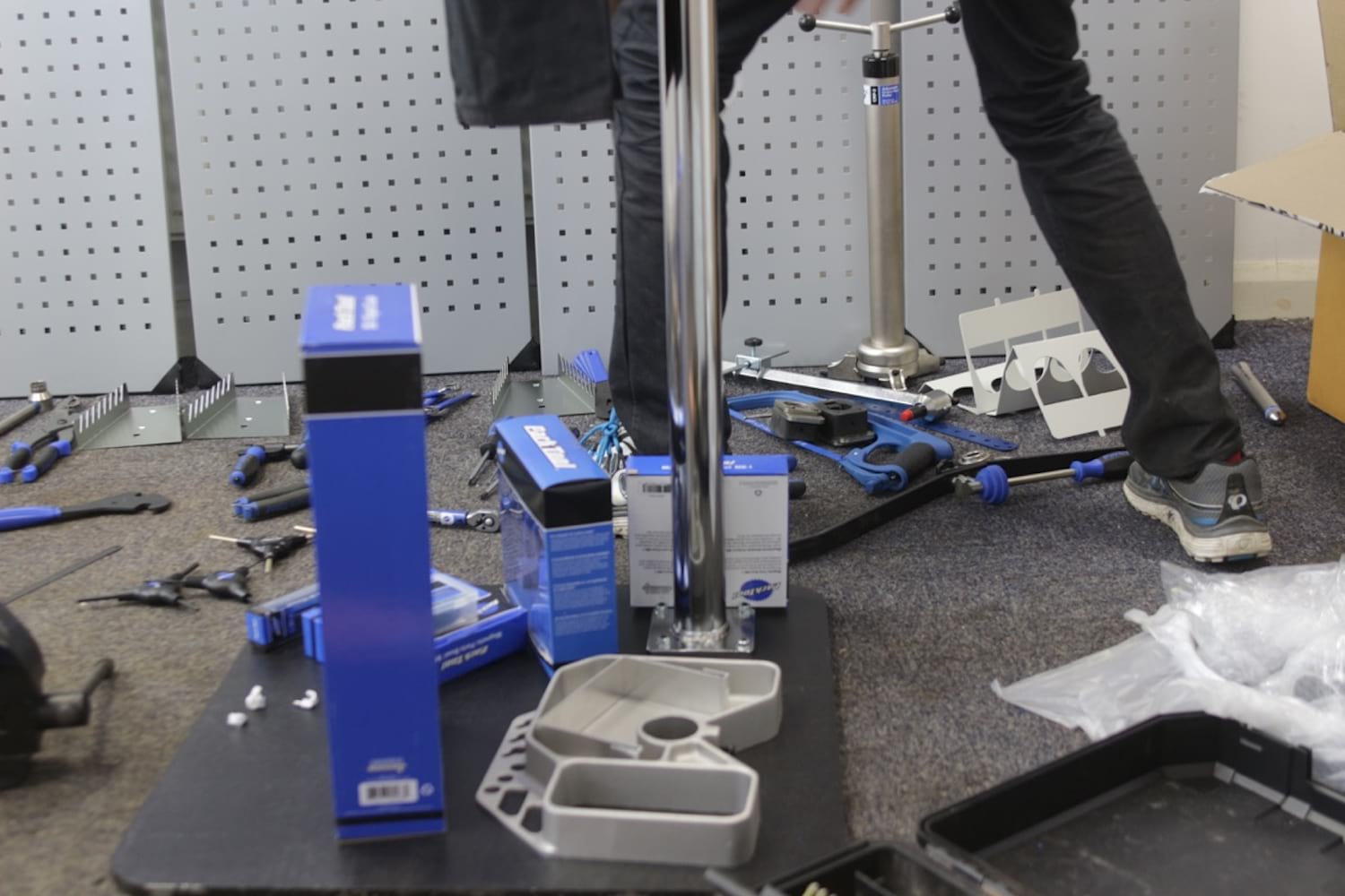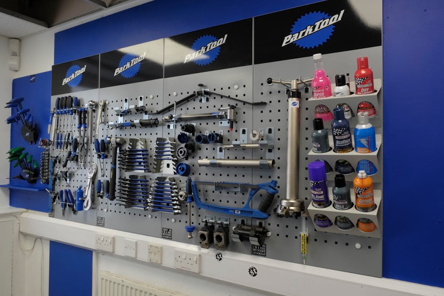Our workbench also got the blue paint treatment, before being stocked with a new wheel truing stand, and even some Park Tool gloves in matching blue.