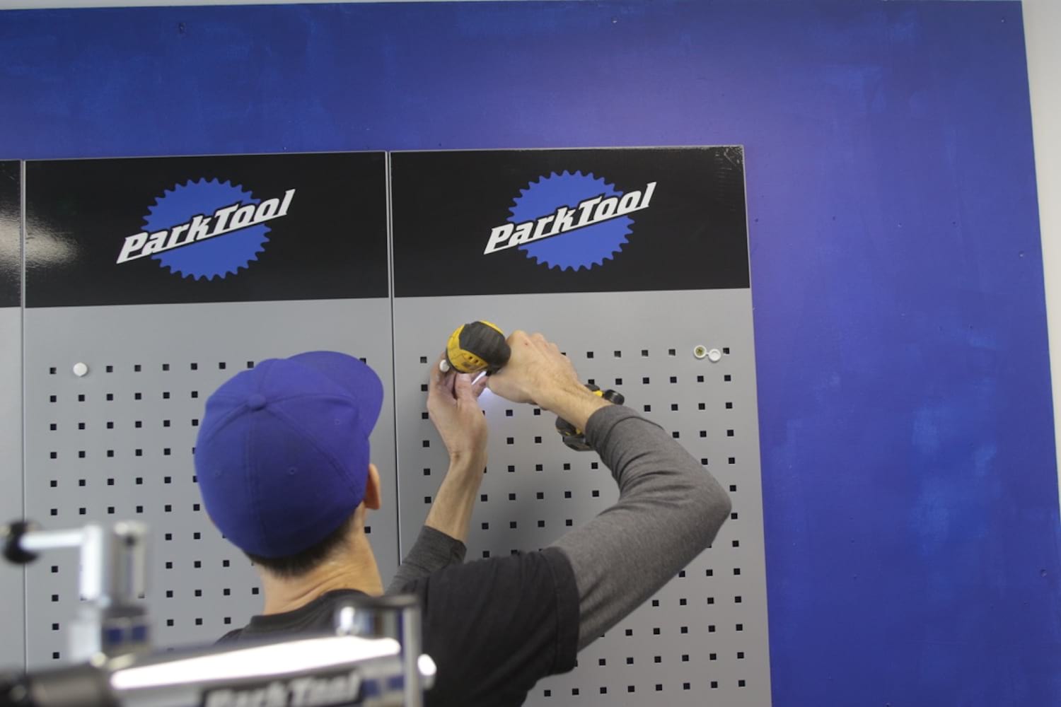 With the paint dry, panels went on the wall to give us a big flexible area for mounting tools.