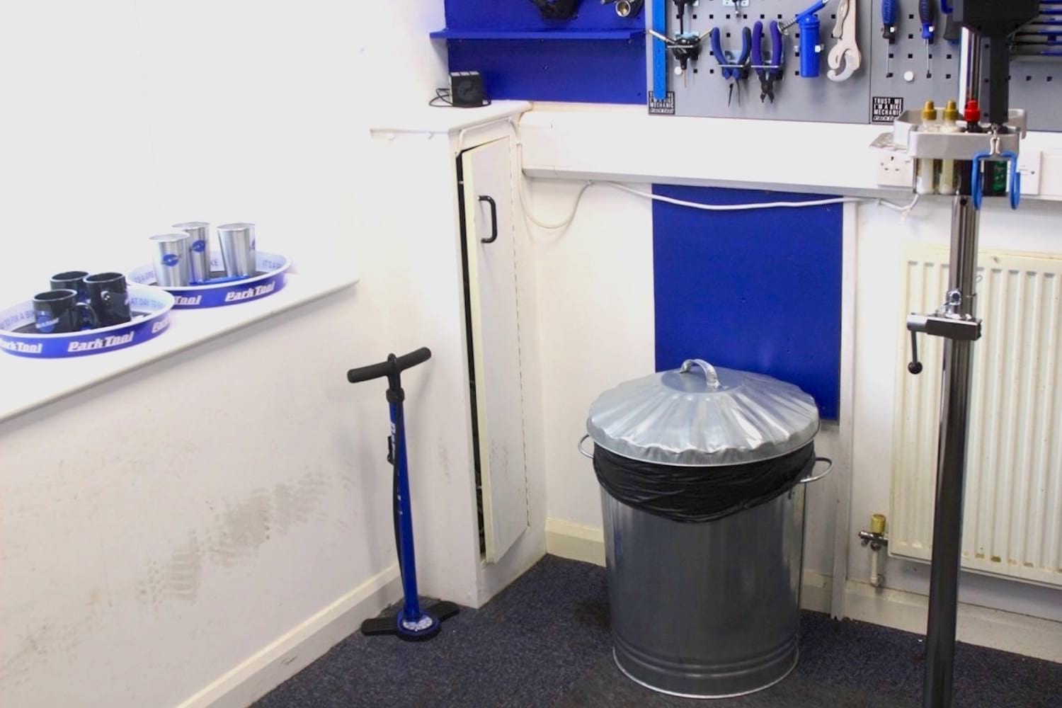 If you want to keep things tidy, it’s a good idea to have a bin. It’s our own bin though, and it’s even escaped the Park Tool makeover. But never mind that, what’s that on the left?
