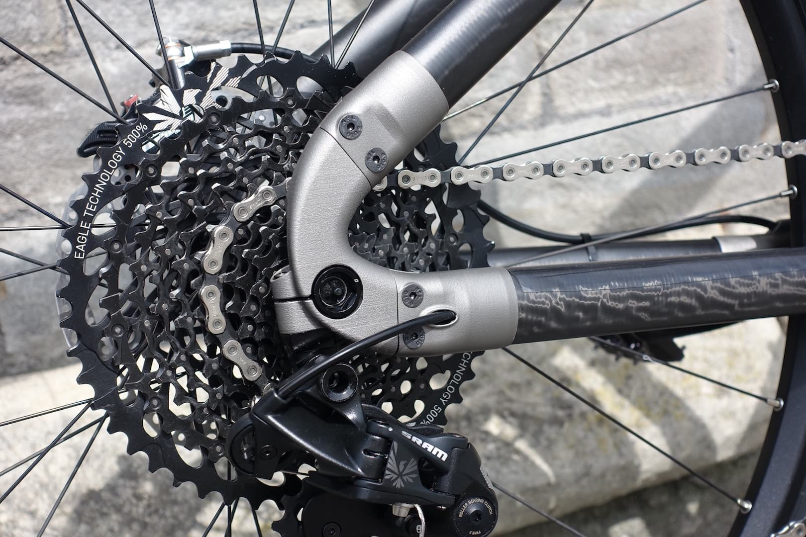 The dropped chainstay yoke is made from 3D printed stainless steel.