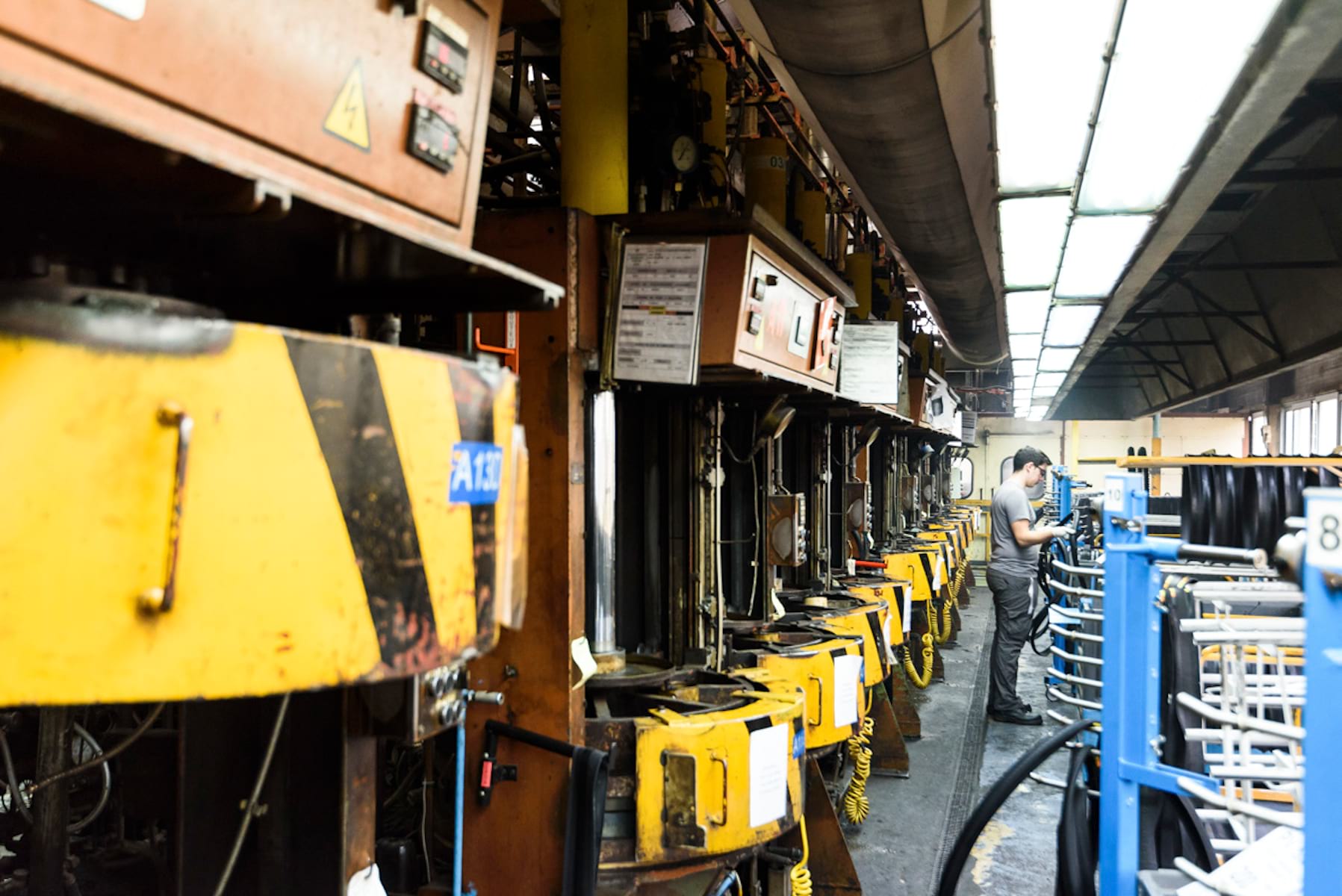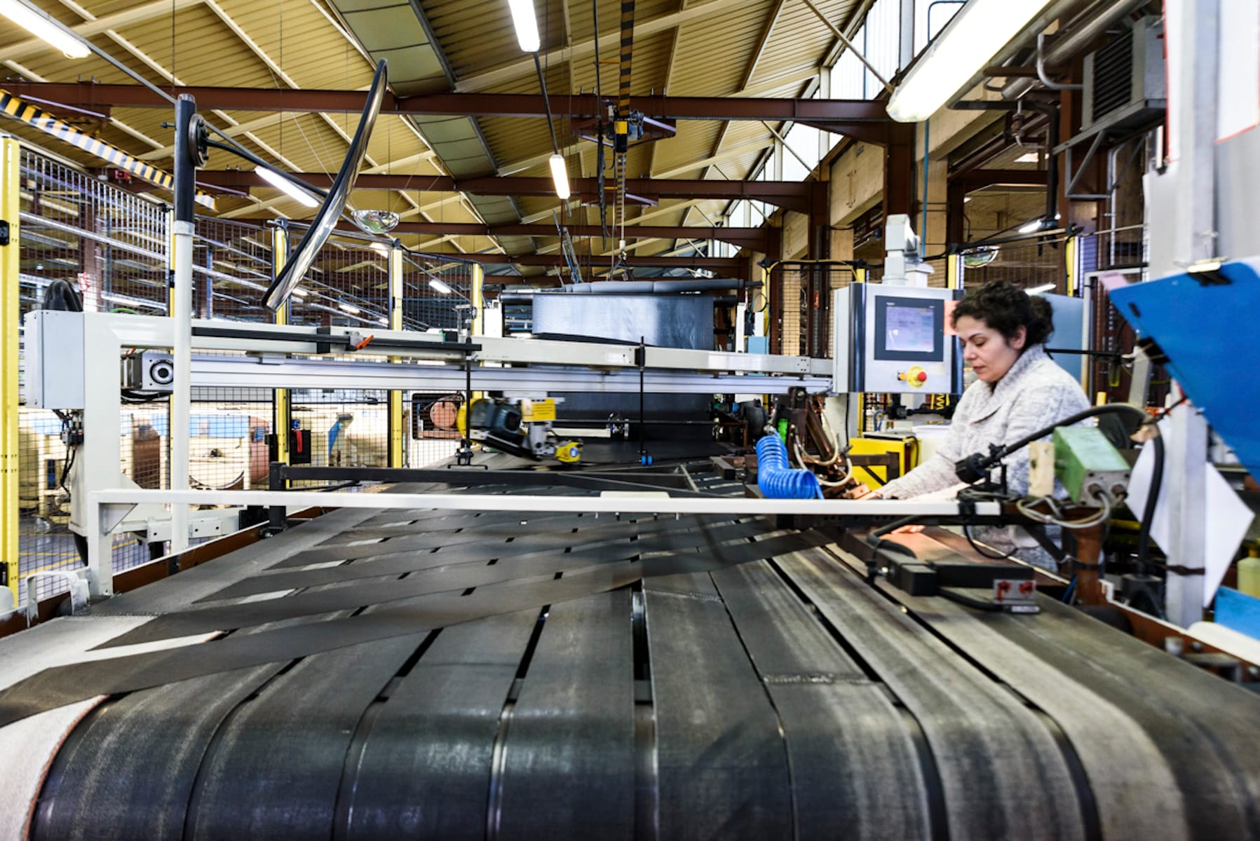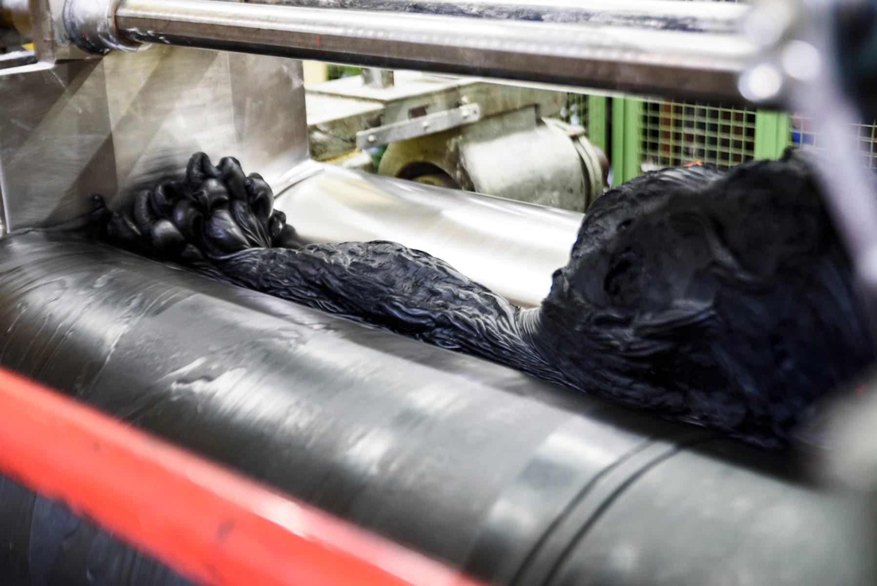 Our first port of call is across the yard in the rubber mixing plant, where varying quantities of natural and synthetic rubbers, carbon black, sulphur and other plasticising agents are heated, mixed, rolled and drawn out again and again to produce roughly 40 tonnes of rubber compound a day. Giant containers of up to 30 raw materials sit, waiting to be thrown into the two heated cylindrical machines that are described to us as oversized cake mixers. In spite of the crisp early morning outside, inside the factory it is hot, noisy and surprisingly humid – the natural rubber has to be stored at 60% humidity to prevent it from drying out and has its own special sealed-off storeroom. The air is also thick with not unpleasant pungent smells emanating from the raw materials, yet is surprisingly dust free – in spite of the large quantity of carbon black in use, huge extractors do an excellent job of keeping things clean.