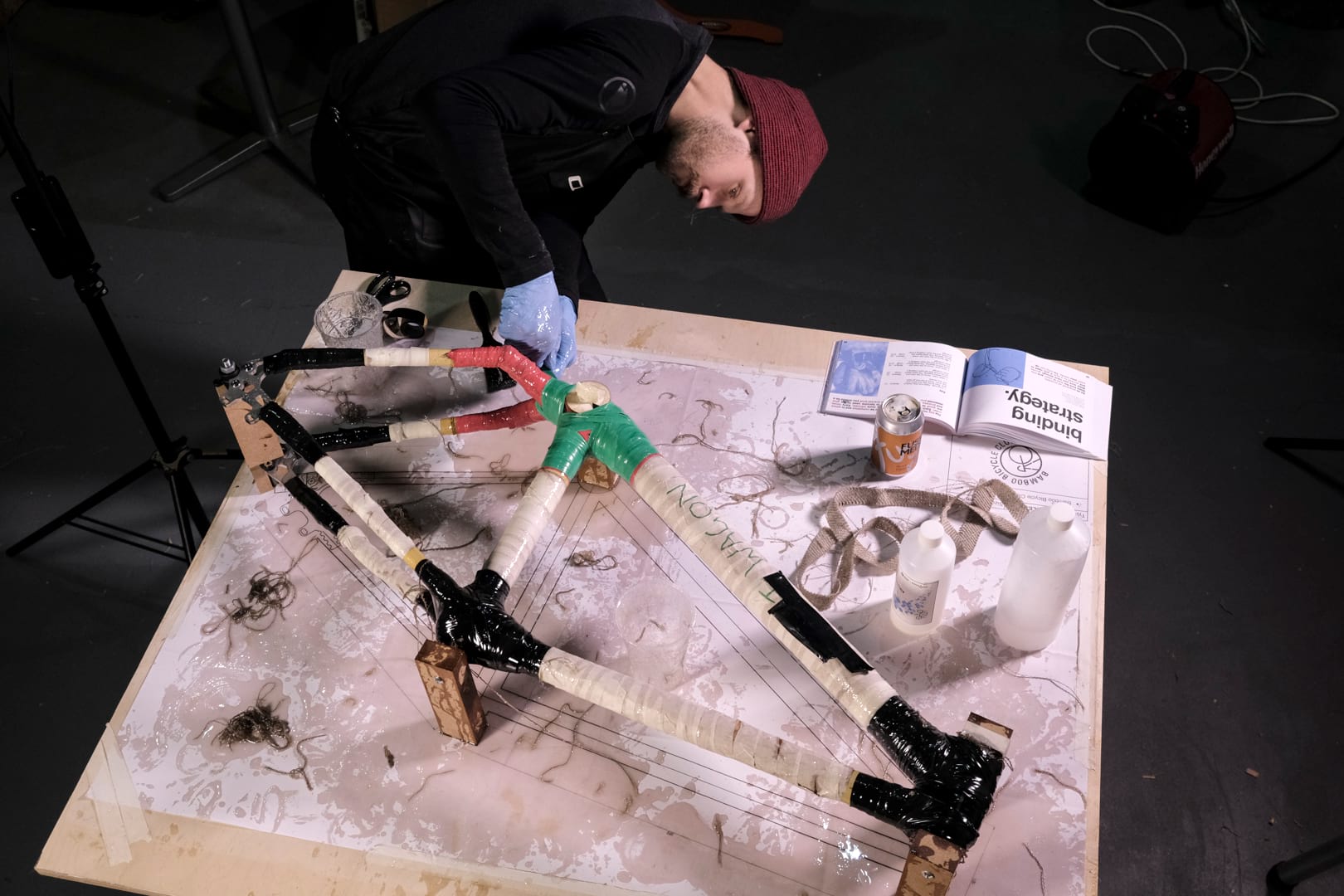 ‘Urgh! It’s disgusting!’ My nose wrinkles and I recoil slightly at the sight in my hands. Gloved fingers are pinching a strip of hemp, saturating the fabric with epoxy as I run my fingertips from the top down to the bottom, collecting and expunging big gobs of translucent epoxy along the way. If anyone was to walk in now, I imagine it looks like I’m harvesting alien eggs in a ghetto laboratory. The two-part epoxy has been reacting for about 20 minutes now, and it’s quite warm in my hands. It’s a weirdly enjoyable experience, while also being very, very messy. I think I’ve ruined my new shirt.